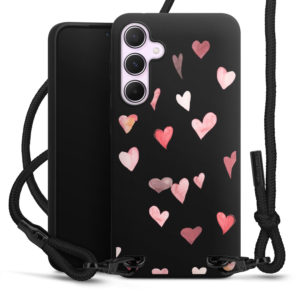 The matt black silicone case is made of flexible TPU (thermoplastic polyurethane) and offers robust protection. The durable, unbreakable material makes the cover flexible and dimensionally stable at the same time. The matte surface makes your design stand out more and is less susceptible to fingerprints and dirt. The stylish trend accessory fits comfortably in the hand and is perfectly complemented by the fabric (polyester) mobile phone strap. The braided fabric strap is approx. 1.70 metres long with a diameter of approx. 0.5 cm. Due to the special knotting technique, the length of the strap can be adjusted by simply pulling it, so that you can adapt it individually to your wishes. The practical case to wear around your neck is available with the fabric strap in black. As a little icing on the cake, we have provided the strap with a chic metal fastener in matt black. The strap is securely fastened to the case with loops made of high-quality genuine leather and press studs. The ends of the fabric strap are covered with metallic end caps and thus protected from fraying.