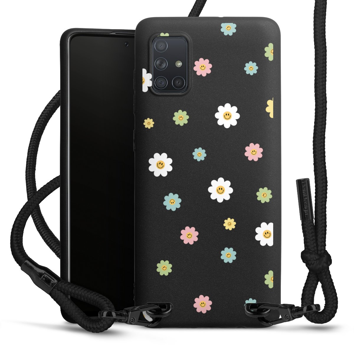 The matt black silicone case is made of flexible TPU (thermoplastic polyurethane) and offers robust protection. The durable, unbreakable material makes the cover flexible and dimensionally stable at the same time. The matte surface makes your design stand out more and is less susceptible to fingerprints and dirt. The stylish trend accessory fits comfortably in the hand and is perfectly complemented by the fabric (polyester) mobile phone strap. The braided fabric strap is approx. 1.70 metres long with a diameter of approx. 0.5 cm. Due to the special knotting technique, the length of the strap can be adjusted by simply pulling it, so that you can adapt it individually to your wishes. The practical case to wear around your neck is available with the fabric strap in black. As a little icing on the cake, we have provided the strap with a chic metal fastener in matt black. The strap is securely fastened to the case with loops made of high-quality genuine leather and press studs. The ends of the fabric strap are covered with metallic end caps and thus protected from fraying.