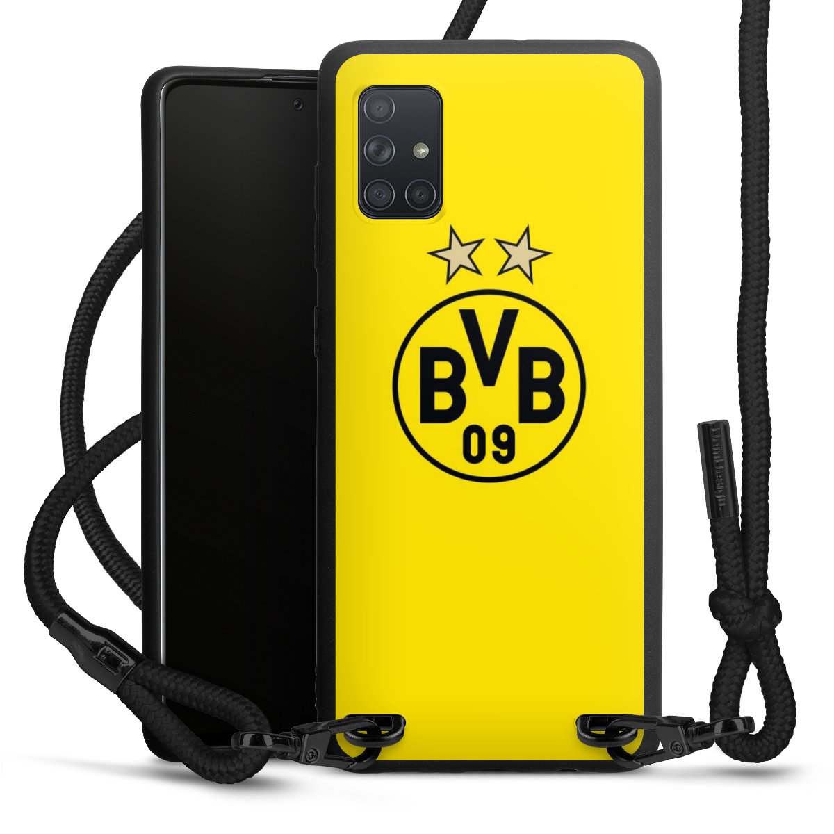 The matt black silicone case is made of flexible TPU (thermoplastic polyurethane) and offers robust protection. The durable, unbreakable material makes the cover flexible and dimensionally stable at the same time. The matte surface makes your design stand out more and is less susceptible to fingerprints and dirt. The stylish trend accessory fits comfortably in the hand and is perfectly complemented by the fabric (polyester) mobile phone strap. The braided fabric strap is approx. 1.70 metres long with a diameter of approx. 0.5 cm. Due to the special knotting technique, the length of the strap can be adjusted by simply pulling it, so that you can adapt it individually to your wishes. The practical case to wear around your neck is available with the fabric strap in black. As a little icing on the cake, we have provided the strap with a chic metal fastener in matt black. The strap is securely fastened to the case with loops made of high-quality genuine leather and press studs. The ends of the fabric strap are covered with metallic end caps and thus protected from fraying.