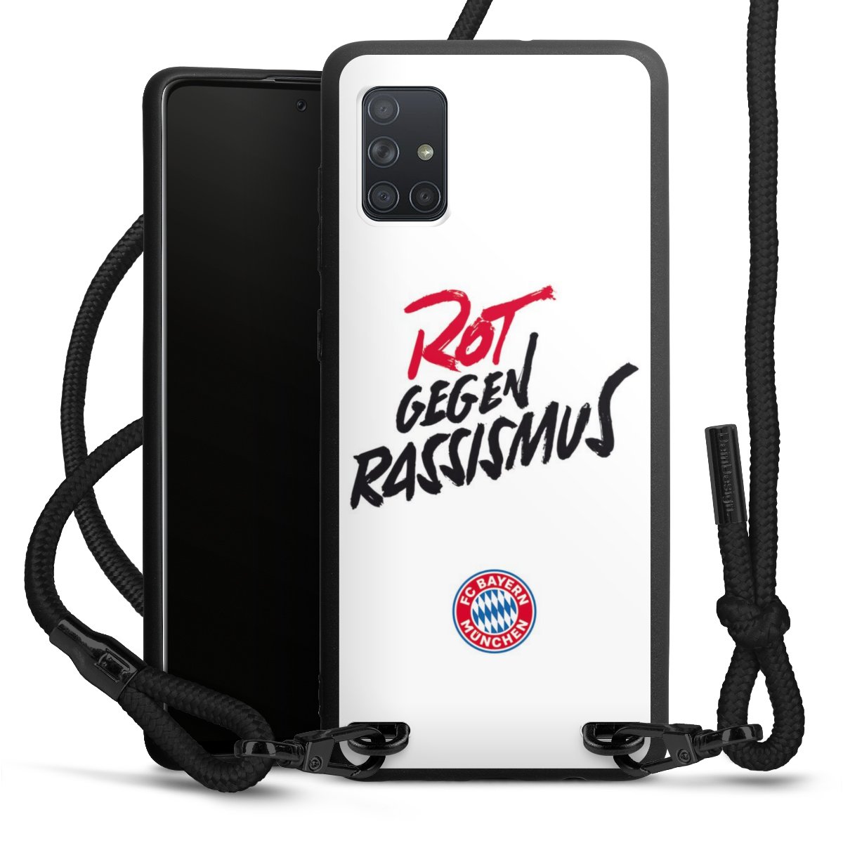 The matt black silicone case is made of flexible TPU (thermoplastic polyurethane) and offers robust protection. The durable, unbreakable material makes the cover flexible and dimensionally stable at the same time. The matte surface makes your design stand out more and is less susceptible to fingerprints and dirt. The stylish trend accessory fits comfortably in the hand and is perfectly complemented by the fabric (polyester) mobile phone strap. The braided fabric strap is approx. 1.70 metres long with a diameter of approx. 0.5 cm. Due to the special knotting technique, the length of the strap can be adjusted by simply pulling it, so that you can adapt it individually to your wishes. The practical case to wear around your neck is available with the fabric strap in black. As a little icing on the cake, we have provided the strap with a chic metal fastener in matt black. The strap is securely fastened to the case with loops made of high-quality genuine leather and press studs. The ends of the fabric strap are covered with metallic end caps and thus protected from fraying.