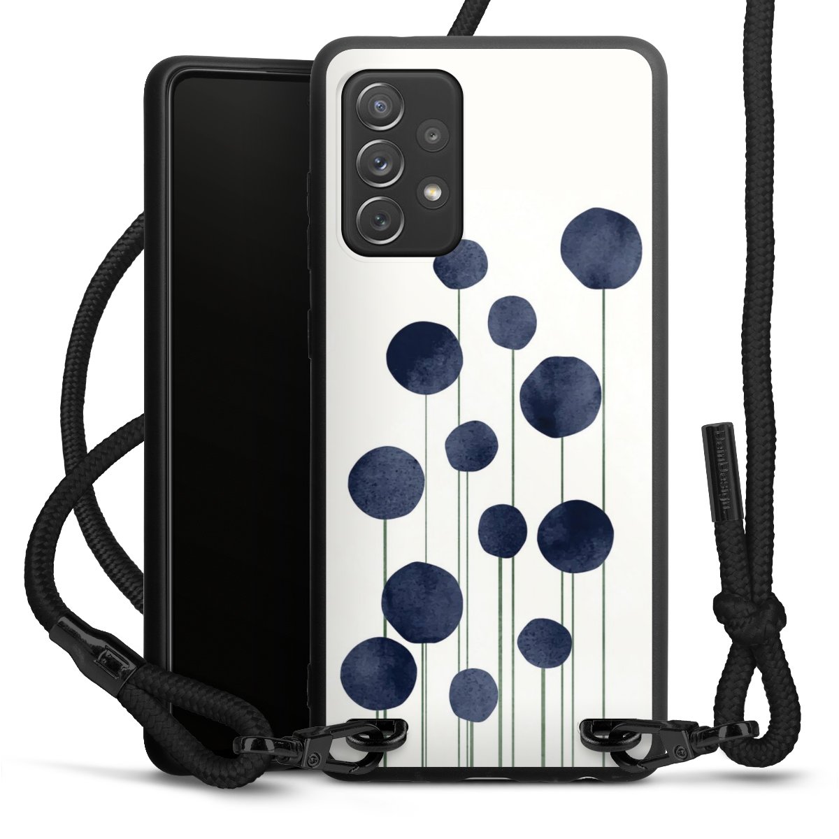 The matt black silicone case is made of flexible TPU (thermoplastic polyurethane) and offers robust protection. The durable, unbreakable material makes the cover flexible and dimensionally stable at the same time. The matte surface makes your design stand out more and is less susceptible to fingerprints and dirt. The stylish trend accessory fits comfortably in the hand and is perfectly complemented by the fabric (polyester) mobile phone strap. The braided fabric strap is approx. 1.70 metres long with a diameter of approx. 0.5 cm. Due to the special knotting technique, the length of the strap can be adjusted by simply pulling it, so that you can adapt it individually to your wishes. The practical case to wear around your neck is available with the fabric strap in black. As a little icing on the cake, we have provided the strap with a chic metal fastener in matt black. The strap is securely fastened to the case with loops made of high-quality genuine leather and press studs. The ends of the fabric strap are covered with metallic end caps and thus protected from fraying.
