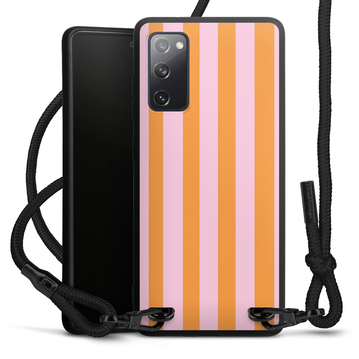 The matt black silicone case is made of flexible TPU (thermoplastic polyurethane) and offers robust protection. The durable, unbreakable material makes the cover flexible and dimensionally stable at the same time. The matte surface makes your design stand out more and is less susceptible to fingerprints and dirt. The stylish trend accessory fits comfortably in the hand and is perfectly complemented by the fabric (polyester) mobile phone strap. The braided fabric strap is approx. 1.70 metres long with a diameter of approx. 0.5 cm. Due to the special knotting technique, the length of the strap can be adjusted by simply pulling it, so that you can adapt it individually to your wishes. The practical case to wear around your neck is available with the fabric strap in black. As a little icing on the cake, we have provided the strap with a chic metal fastener in matt black. The strap is securely fastened to the case with loops made of high-quality genuine leather and press studs. The ends of the fabric strap are covered with metallic end caps and thus protected from fraying.