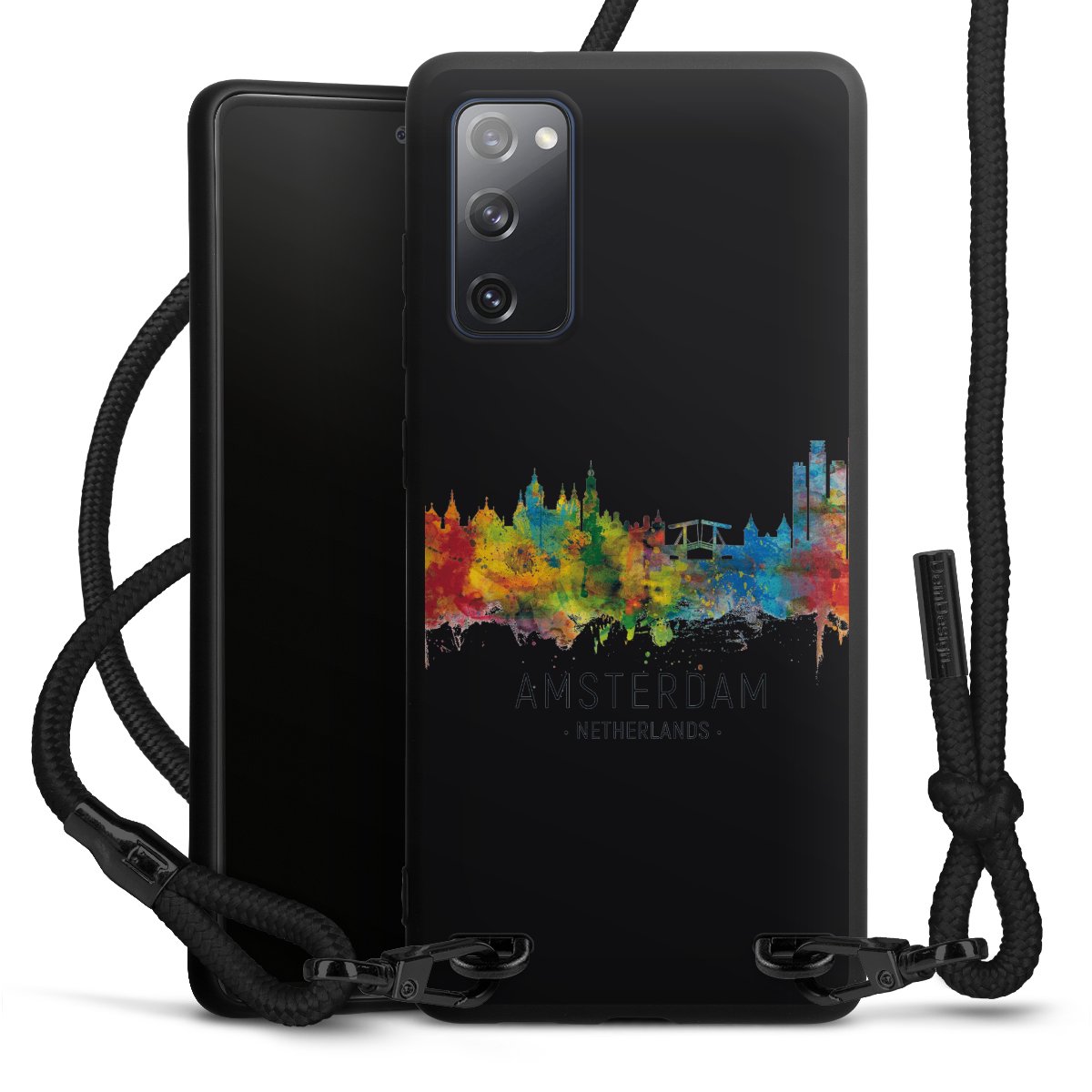The matt black silicone case is made of flexible TPU (thermoplastic polyurethane) and offers robust protection. The durable, unbreakable material makes the cover flexible and dimensionally stable at the same time. The matte surface makes your design stand out more and is less susceptible to fingerprints and dirt. The stylish trend accessory fits comfortably in the hand and is perfectly complemented by the fabric (polyester) mobile phone strap. The braided fabric strap is approx. 1.70 metres long with a diameter of approx. 0.5 cm. Due to the special knotting technique, the length of the strap can be adjusted by simply pulling it, so that you can adapt it individually to your wishes. The practical case to wear around your neck is available with the fabric strap in black. As a little icing on the cake, we have provided the strap with a chic metal fastener in matt black. The strap is securely fastened to the case with loops made of high-quality genuine leather and press studs. The ends of the fabric strap are covered with metallic end caps and thus protected from fraying.