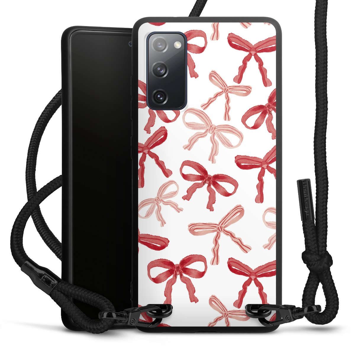 The matt black silicone case is made of flexible TPU (thermoplastic polyurethane) and offers robust protection. The durable, unbreakable material makes the cover flexible and dimensionally stable at the same time. The matte surface makes your design stand out more and is less susceptible to fingerprints and dirt. The stylish trend accessory fits comfortably in the hand and is perfectly complemented by the fabric (polyester) mobile phone strap. The braided fabric strap is approx. 1.70 metres long with a diameter of approx. 0.5 cm. Due to the special knotting technique, the length of the strap can be adjusted by simply pulling it, so that you can adapt it individually to your wishes. The practical case to wear around your neck is available with the fabric strap in black. As a little icing on the cake, we have provided the strap with a chic metal fastener in matt black. The strap is securely fastened to the case with loops made of high-quality genuine leather and press studs. The ends of the fabric strap are covered with metallic end caps and thus protected from fraying.