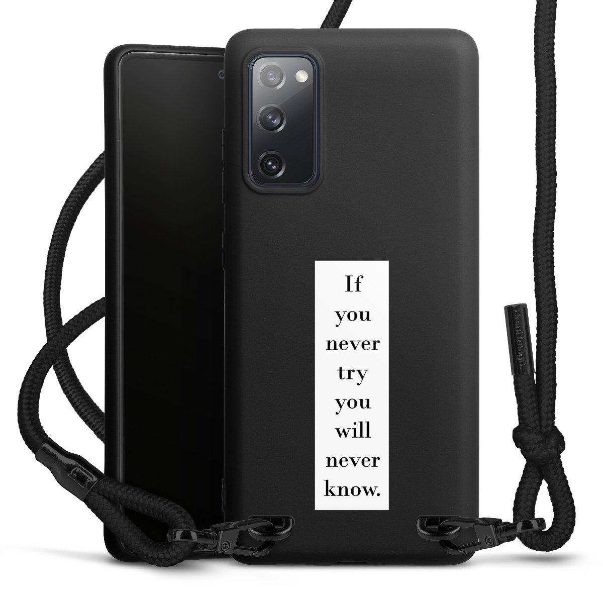 The matt black silicone case is made of flexible TPU (thermoplastic polyurethane) and offers robust protection. The durable, unbreakable material makes the cover flexible and dimensionally stable at the same time. The matte surface makes your design stand out more and is less susceptible to fingerprints and dirt. The stylish trend accessory fits comfortably in the hand and is perfectly complemented by the fabric (polyester) mobile phone strap. The braided fabric strap is approx. 1.70 metres long with a diameter of approx. 0.5 cm. Due to the special knotting technique, the length of the strap can be adjusted by simply pulling it, so that you can adapt it individually to your wishes. The practical case to wear around your neck is available with the fabric strap in black. As a little icing on the cake, we have provided the strap with a chic metal fastener in matt black. The strap is securely fastened to the case with loops made of high-quality genuine leather and press studs. The ends of the fabric strap are covered with metallic end caps and thus protected from fraying.