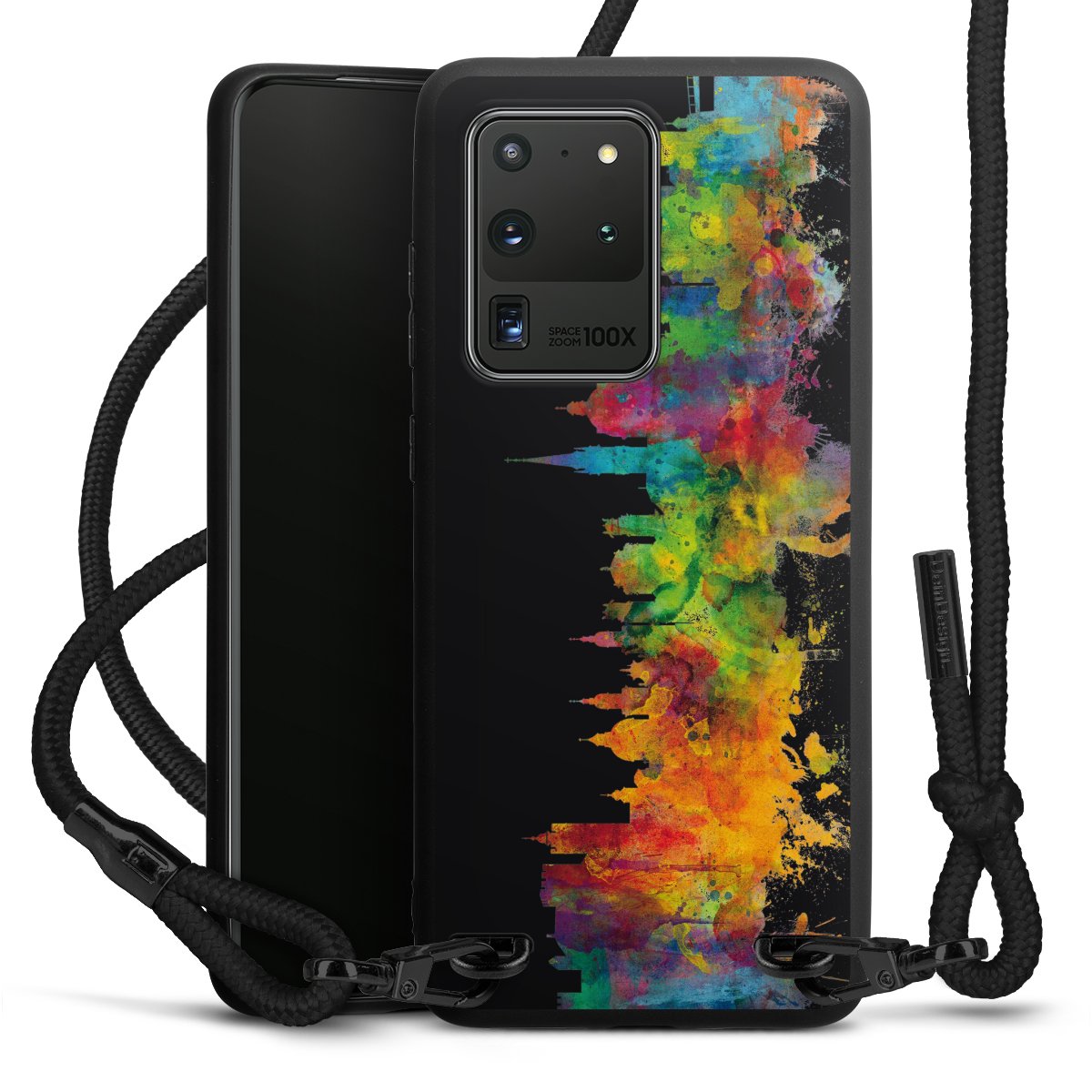 We use the solid direct print process for this phone case, which is why the print area only covers the back and the edge remains unprinted. The case to wear around your neck can be ordered unprinted, fully printed, or partially printed. For your design, either choose one of our exclusive shop motifs or get creative and create your own design, for example with photos and overlays. Design your own personal trend accessory and make an individual statement on the streets!