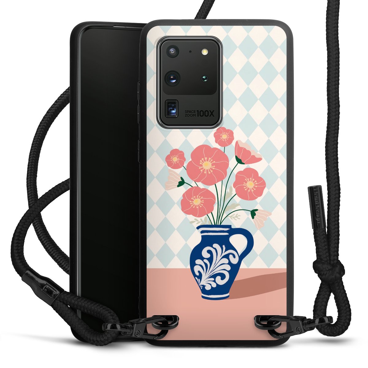 The matt black silicone case is made of flexible TPU (thermoplastic polyurethane) and offers robust protection. The durable, unbreakable material makes the cover flexible and dimensionally stable at the same time. The matte surface makes your design stand out more and is less susceptible to fingerprints and dirt. The stylish trend accessory fits comfortably in the hand and is perfectly complemented by the fabric (polyester) mobile phone strap. The braided fabric strap is approx. 1.70 metres long with a diameter of approx. 0.5 cm. Due to the special knotting technique, the length of the strap can be adjusted by simply pulling it, so that you can adapt it individually to your wishes. The practical case to wear around your neck is available with the fabric strap in black. As a little icing on the cake, we have provided the strap with a chic metal fastener in matt black. The strap is securely fastened to the case with loops made of high-quality genuine leather and press studs. The ends of the fabric strap are covered with metallic end caps and thus protected from fraying.