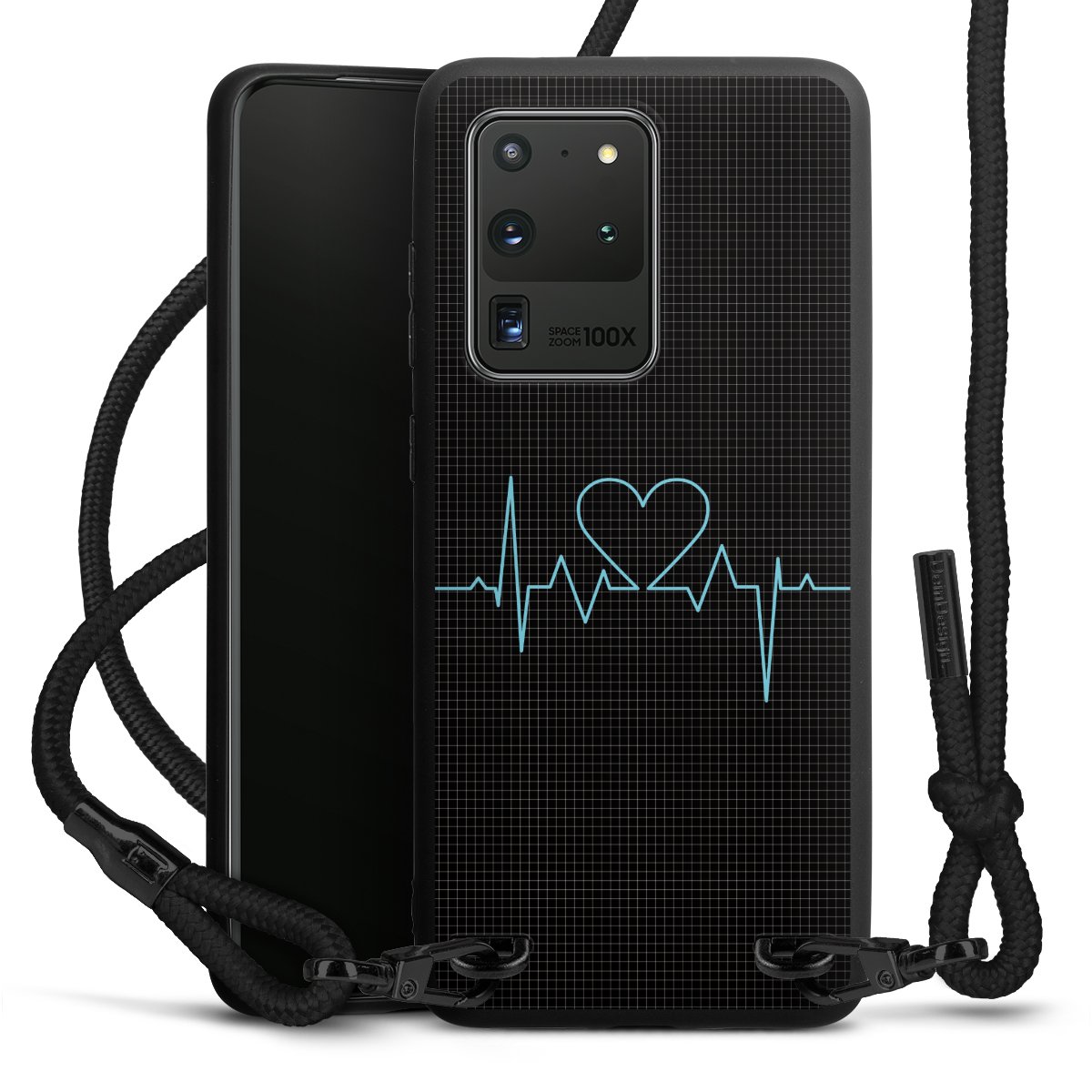 The matt black silicone case is made of flexible TPU (thermoplastic polyurethane) and offers robust protection. The durable, unbreakable material makes the cover flexible and dimensionally stable at the same time. The matte surface makes your design stand out more and is less susceptible to fingerprints and dirt. The stylish trend accessory fits comfortably in the hand and is perfectly complemented by the fabric (polyester) mobile phone strap. The braided fabric strap is approx. 1.70 metres long with a diameter of approx. 0.5 cm. Due to the special knotting technique, the length of the strap can be adjusted by simply pulling it, so that you can adapt it individually to your wishes. The practical case to wear around your neck is available with the fabric strap in black. As a little icing on the cake, we have provided the strap with a chic metal fastener in matt black. The strap is securely fastened to the case with loops made of high-quality genuine leather and press studs. The ends of the fabric strap are covered with metallic end caps and thus protected from fraying.
