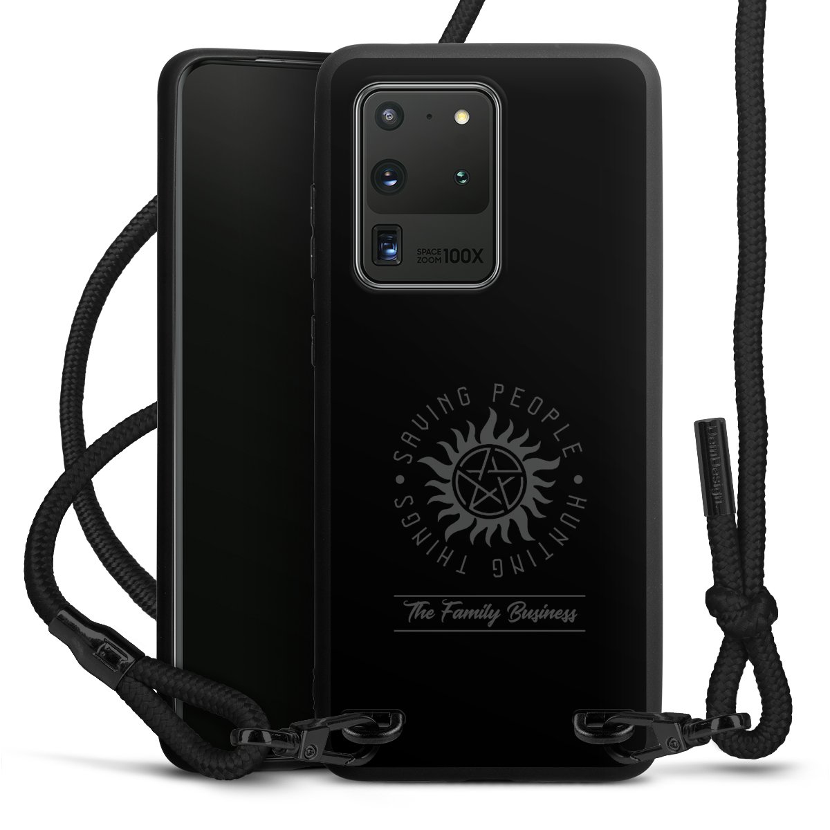 The matt black silicone case is made of flexible TPU (thermoplastic polyurethane) and offers robust protection. The durable, unbreakable material makes the cover flexible and dimensionally stable at the same time. The matte surface makes your design stand out more and is less susceptible to fingerprints and dirt. The stylish trend accessory fits comfortably in the hand and is perfectly complemented by the fabric (polyester) mobile phone strap. The braided fabric strap is approx. 1.70 metres long with a diameter of approx. 0.5 cm. Due to the special knotting technique, the length of the strap can be adjusted by simply pulling it, so that you can adapt it individually to your wishes. The practical case to wear around your neck is available with the fabric strap in black. As a little icing on the cake, we have provided the strap with a chic metal fastener in matt black. The strap is securely fastened to the case with loops made of high-quality genuine leather and press studs. The ends of the fabric strap are covered with metallic end caps and thus protected from fraying.