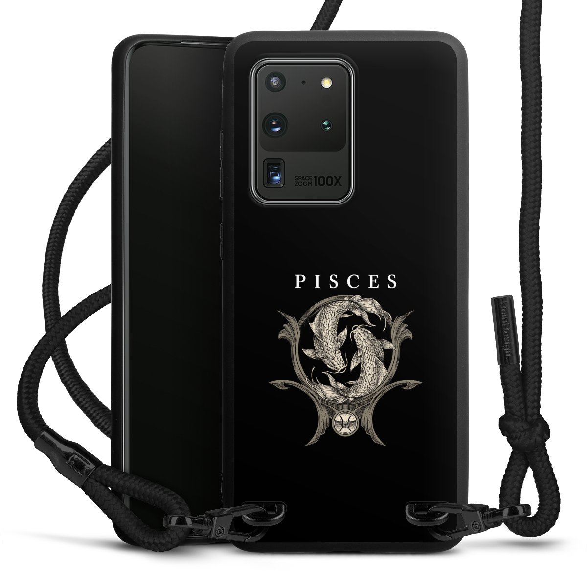 The matt black silicone case is made of flexible TPU (thermoplastic polyurethane) and offers robust protection. The durable, unbreakable material makes the cover flexible and dimensionally stable at the same time. The matte surface makes your design stand out more and is less susceptible to fingerprints and dirt. The stylish trend accessory fits comfortably in the hand and is perfectly complemented by the fabric (polyester) mobile phone strap. The braided fabric strap is approx. 1.70 metres long with a diameter of approx. 0.5 cm. Due to the special knotting technique, the length of the strap can be adjusted by simply pulling it, so that you can adapt it individually to your wishes. The practical case to wear around your neck is available with the fabric strap in black. As a little icing on the cake, we have provided the strap with a chic metal fastener in matt black. The strap is securely fastened to the case with loops made of high-quality genuine leather and press studs. The ends of the fabric strap are covered with metallic end caps and thus protected from fraying.