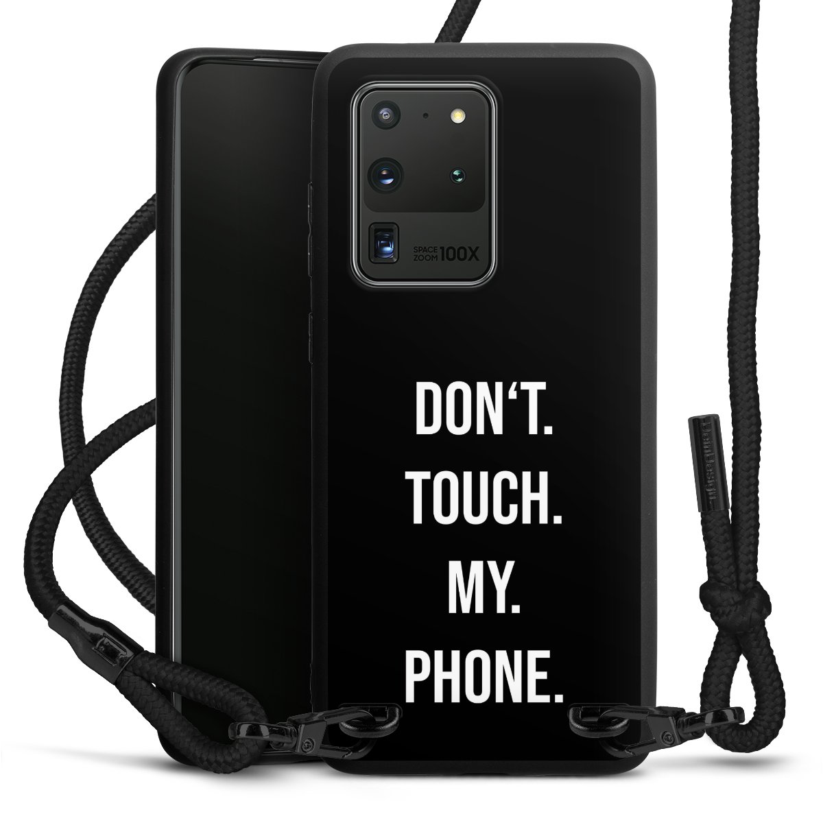 The matt black silicone case is made of flexible TPU (thermoplastic polyurethane) and offers robust protection. The durable, unbreakable material makes the cover flexible and dimensionally stable at the same time. The matte surface makes your design stand out more and is less susceptible to fingerprints and dirt. The stylish trend accessory fits comfortably in the hand and is perfectly complemented by the fabric (polyester) mobile phone strap. The braided fabric strap is approx. 1.70 metres long with a diameter of approx. 0.5 cm. Due to the special knotting technique, the length of the strap can be adjusted by simply pulling it, so that you can adapt it individually to your wishes. The practical case to wear around your neck is available with the fabric strap in black. As a little icing on the cake, we have provided the strap with a chic metal fastener in matt black. The strap is securely fastened to the case with loops made of high-quality genuine leather and press studs. The ends of the fabric strap are covered with metallic end caps and thus protected from fraying.