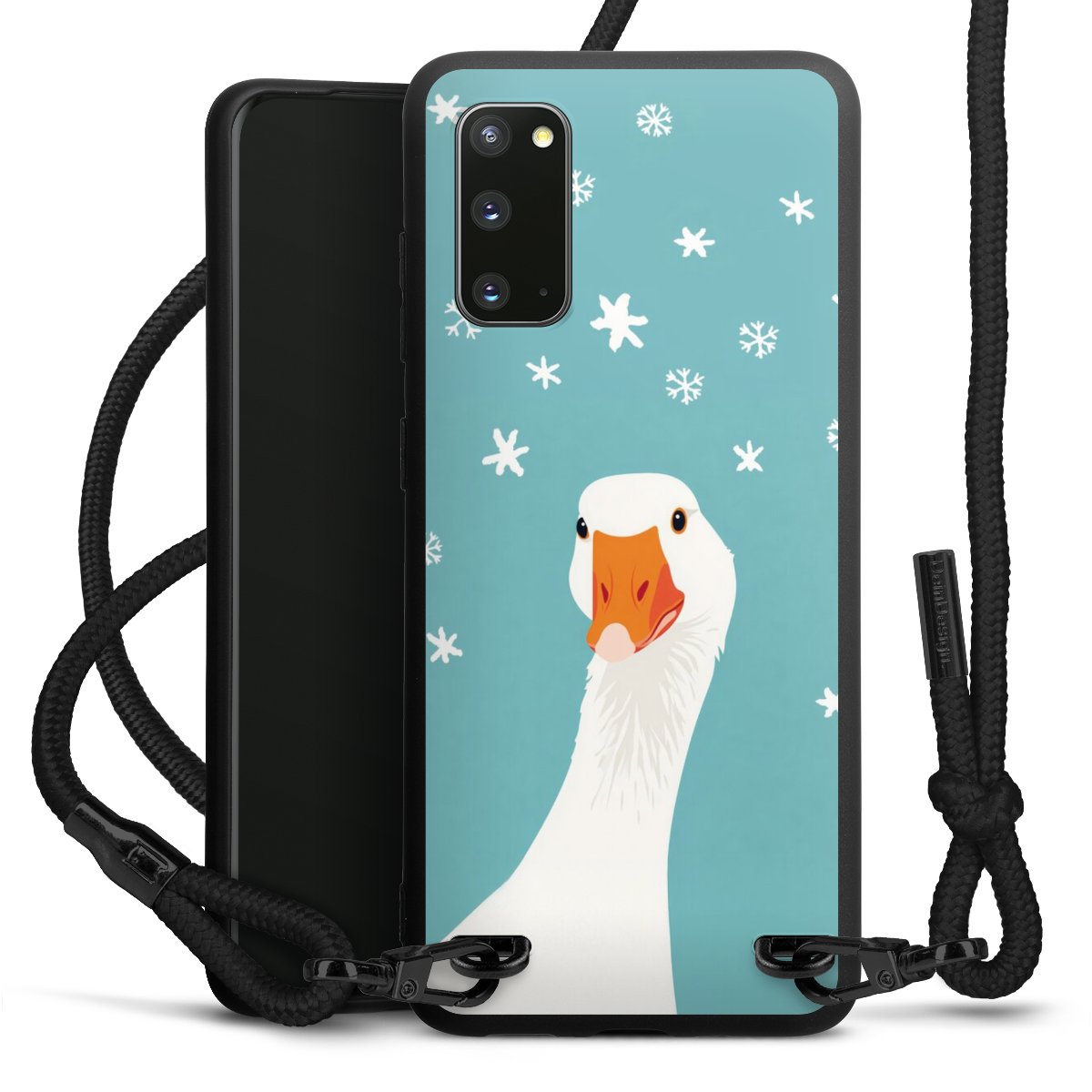 The matt black silicone case is made of flexible TPU (thermoplastic polyurethane) and offers robust protection. The durable, unbreakable material makes the cover flexible and dimensionally stable at the same time. The matte surface makes your design stand out more and is less susceptible to fingerprints and dirt. The stylish trend accessory fits comfortably in the hand and is perfectly complemented by the fabric (polyester) mobile phone strap. The braided fabric strap is approx. 1.70 metres long with a diameter of approx. 0.5 cm. Due to the special knotting technique, the length of the strap can be adjusted by simply pulling it, so that you can adapt it individually to your wishes. The practical case to wear around your neck is available with the fabric strap in black. As a little icing on the cake, we have provided the strap with a chic metal fastener in matt black. The strap is securely fastened to the case with loops made of high-quality genuine leather and press studs. The ends of the fabric strap are covered with metallic end caps and thus protected from fraying.