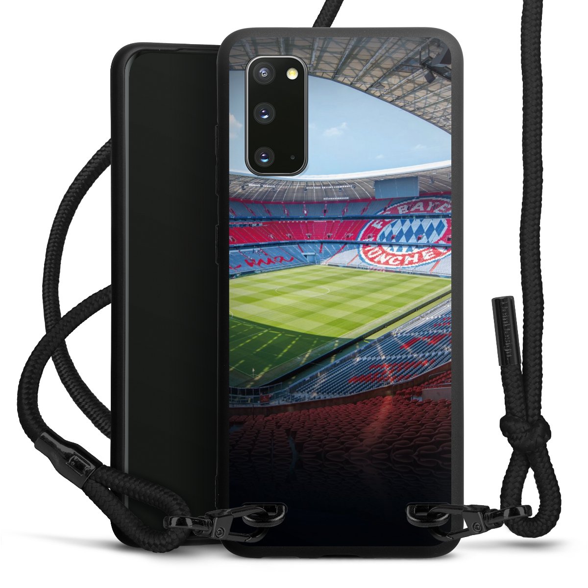 The matt black silicone case is made of flexible TPU (thermoplastic polyurethane) and offers robust protection. The durable, unbreakable material makes the cover flexible and dimensionally stable at the same time. The matte surface makes your design stand out more and is less susceptible to fingerprints and dirt. The stylish trend accessory fits comfortably in the hand and is perfectly complemented by the fabric (polyester) mobile phone strap. The braided fabric strap is approx. 1.70 metres long with a diameter of approx. 0.5 cm. Due to the special knotting technique, the length of the strap can be adjusted by simply pulling it, so that you can adapt it individually to your wishes. The practical case to wear around your neck is available with the fabric strap in black. As a little icing on the cake, we have provided the strap with a chic metal fastener in matt black. The strap is securely fastened to the case with loops made of high-quality genuine leather and press studs. The ends of the fabric strap are covered with metallic end caps and thus protected from fraying.