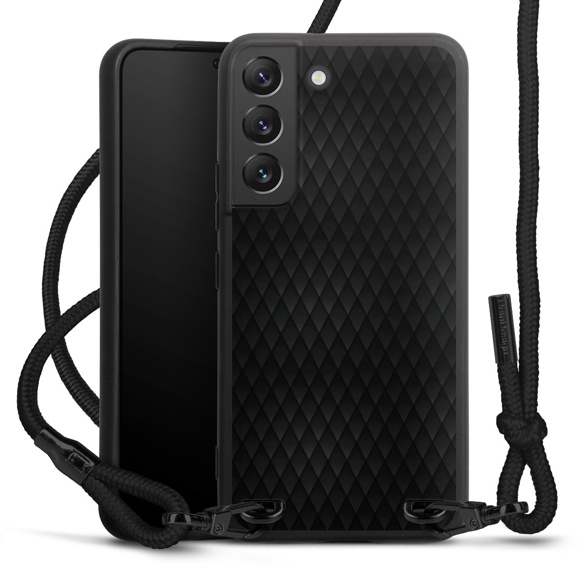 The matt black silicone case is made of flexible TPU (thermoplastic polyurethane) and offers robust protection. The durable, unbreakable material makes the cover flexible and dimensionally stable at the same time. The matte surface makes your design stand out more and is less susceptible to fingerprints and dirt. The stylish trend accessory fits comfortably in the hand and is perfectly complemented by the fabric (polyester) mobile phone strap. The braided fabric strap is approx. 1.70 metres long with a diameter of approx. 0.5 cm. Due to the special knotting technique, the length of the strap can be adjusted by simply pulling it, so that you can adapt it individually to your wishes. The practical case to wear around your neck is available with the fabric strap in black. As a little icing on the cake, we have provided the strap with a chic metal fastener in matt black. The strap is securely fastened to the case with loops made of high-quality genuine leather and press studs. The ends of the fabric strap are covered with metallic end caps and thus protected from fraying.