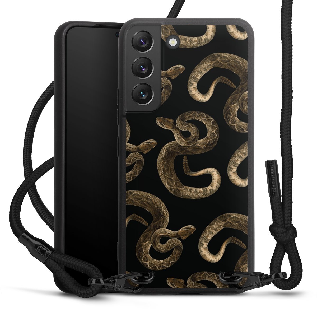 The matt black silicone case is made of flexible TPU (thermoplastic polyurethane) and offers robust protection. The durable, unbreakable material makes the cover flexible and dimensionally stable at the same time. The matte surface makes your design stand out more and is less susceptible to fingerprints and dirt. The stylish trend accessory fits comfortably in the hand and is perfectly complemented by the fabric (polyester) mobile phone strap. The braided fabric strap is approx. 1.70 metres long with a diameter of approx. 0.5 cm. Due to the special knotting technique, the length of the strap can be adjusted by simply pulling it, so that you can adapt it individually to your wishes. The practical case to wear around your neck is available with the fabric strap in black. As a little icing on the cake, we have provided the strap with a chic metal fastener in matt black. The strap is securely fastened to the case with loops made of high-quality genuine leather and press studs. The ends of the fabric strap are covered with metallic end caps and thus protected from fraying.
