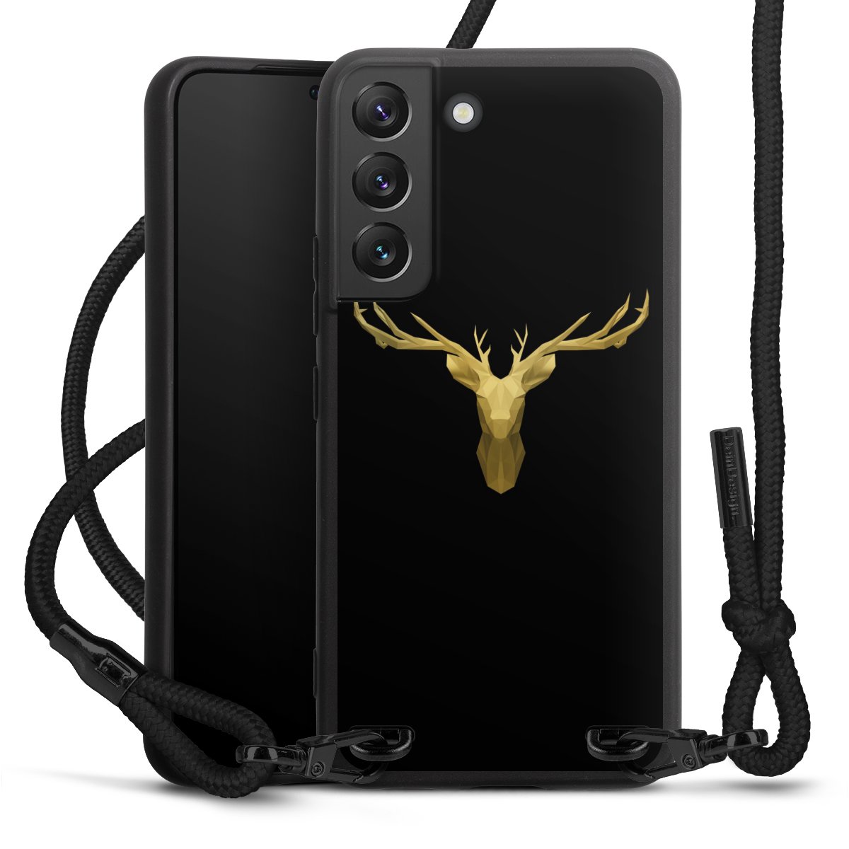 The matt black silicone case is made of flexible TPU (thermoplastic polyurethane) and offers robust protection. The durable, unbreakable material makes the cover flexible and dimensionally stable at the same time. The matte surface makes your design stand out more and is less susceptible to fingerprints and dirt. The stylish trend accessory fits comfortably in the hand and is perfectly complemented by the fabric (polyester) mobile phone strap. The braided fabric strap is approx. 1.70 metres long with a diameter of approx. 0.5 cm. Due to the special knotting technique, the length of the strap can be adjusted by simply pulling it, so that you can adapt it individually to your wishes. The practical case to wear around your neck is available with the fabric strap in black. As a little icing on the cake, we have provided the strap with a chic metal fastener in matt black. The strap is securely fastened to the case with loops made of high-quality genuine leather and press studs. The ends of the fabric strap are covered with metallic end caps and thus protected from fraying.