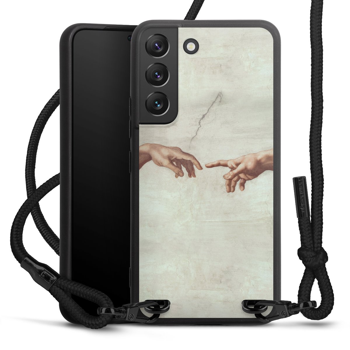 The matt black silicone case is made of flexible TPU (thermoplastic polyurethane) and offers robust protection. The durable, unbreakable material makes the cover flexible and dimensionally stable at the same time. The matte surface makes your design stand out more and is less susceptible to fingerprints and dirt. The stylish trend accessory fits comfortably in the hand and is perfectly complemented by the fabric (polyester) mobile phone strap. The braided fabric strap is approx. 1.70 metres long with a diameter of approx. 0.5 cm. Due to the special knotting technique, the length of the strap can be adjusted by simply pulling it, so that you can adapt it individually to your wishes. The practical case to wear around your neck is available with the fabric strap in black. As a little icing on the cake, we have provided the strap with a chic metal fastener in matt black. The strap is securely fastened to the case with loops made of high-quality genuine leather and press studs. The ends of the fabric strap are covered with metallic end caps and thus protected from fraying.