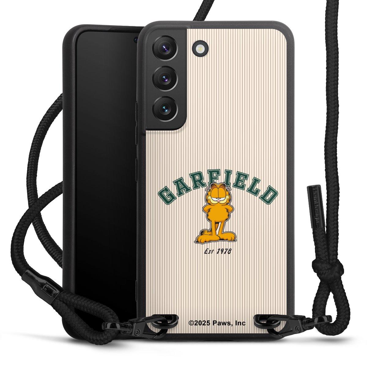 The matt black silicone case is made of flexible TPU (thermoplastic polyurethane) and offers robust protection. The durable, unbreakable material makes the cover flexible and dimensionally stable at the same time. The matte surface makes your design stand out more and is less susceptible to fingerprints and dirt. The stylish trend accessory fits comfortably in the hand and is perfectly complemented by the fabric (polyester) mobile phone strap. The braided fabric strap is approx. 1.70 metres long with a diameter of approx. 0.5 cm. Due to the special knotting technique, the length of the strap can be adjusted by simply pulling it, so that you can adapt it individually to your wishes. The practical case to wear around your neck is available with the fabric strap in black. As a little icing on the cake, we have provided the strap with a chic metal fastener in matt black. The strap is securely fastened to the case with loops made of high-quality genuine leather and press studs. The ends of the fabric strap are covered with metallic end caps and thus protected from fraying.