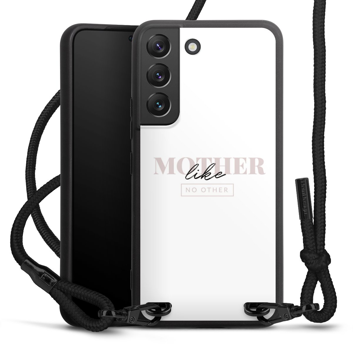 The matt black silicone case is made of flexible TPU (thermoplastic polyurethane) and offers robust protection. The durable, unbreakable material makes the cover flexible and dimensionally stable at the same time. The matte surface makes your design stand out more and is less susceptible to fingerprints and dirt. The stylish trend accessory fits comfortably in the hand and is perfectly complemented by the fabric (polyester) mobile phone strap. The braided fabric strap is approx. 1.70 metres long with a diameter of approx. 0.5 cm. Due to the special knotting technique, the length of the strap can be adjusted by simply pulling it, so that you can adapt it individually to your wishes. The practical case to wear around your neck is available with the fabric strap in black. As a little icing on the cake, we have provided the strap with a chic metal fastener in matt black. The strap is securely fastened to the case with loops made of high-quality genuine leather and press studs. The ends of the fabric strap are covered with metallic end caps and thus protected from fraying.