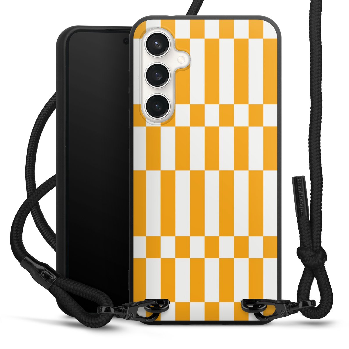 The matt black silicone case is made of flexible TPU (thermoplastic polyurethane) and offers robust protection. The durable, unbreakable material makes the cover flexible and dimensionally stable at the same time. The matte surface makes your design stand out more and is less susceptible to fingerprints and dirt. The stylish trend accessory fits comfortably in the hand and is perfectly complemented by the fabric (polyester) mobile phone strap. The braided fabric strap is approx. 1.70 metres long with a diameter of approx. 0.5 cm. Due to the special knotting technique, the length of the strap can be adjusted by simply pulling it, so that you can adapt it individually to your wishes. The practical case to wear around your neck is available with the fabric strap in black. As a little icing on the cake, we have provided the strap with a chic metal fastener in matt black. The strap is securely fastened to the case with loops made of high-quality genuine leather and press studs. The ends of the fabric strap are covered with metallic end caps and thus protected from fraying.