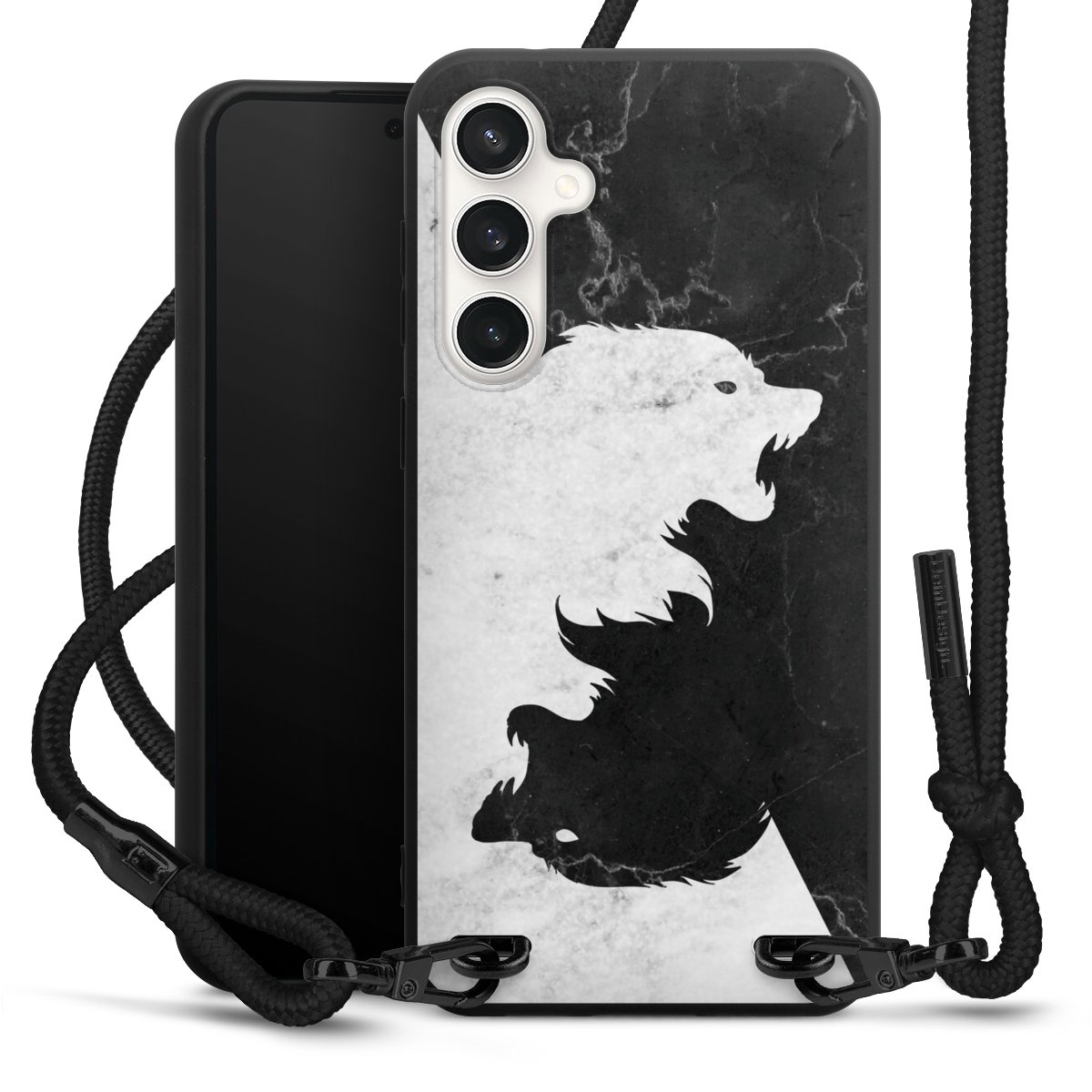 The matt black silicone case is made of flexible TPU (thermoplastic polyurethane) and offers robust protection. The durable, unbreakable material makes the cover flexible and dimensionally stable at the same time. The matte surface makes your design stand out more and is less susceptible to fingerprints and dirt. The stylish trend accessory fits comfortably in the hand and is perfectly complemented by the fabric (polyester) mobile phone strap. The braided fabric strap is approx. 1.70 metres long with a diameter of approx. 0.5 cm. Due to the special knotting technique, the length of the strap can be adjusted by simply pulling it, so that you can adapt it individually to your wishes. The practical case to wear around your neck is available with the fabric strap in black. As a little icing on the cake, we have provided the strap with a chic metal fastener in matt black. The strap is securely fastened to the case with loops made of high-quality genuine leather and press studs. The ends of the fabric strap are covered with metallic end caps and thus protected from fraying.