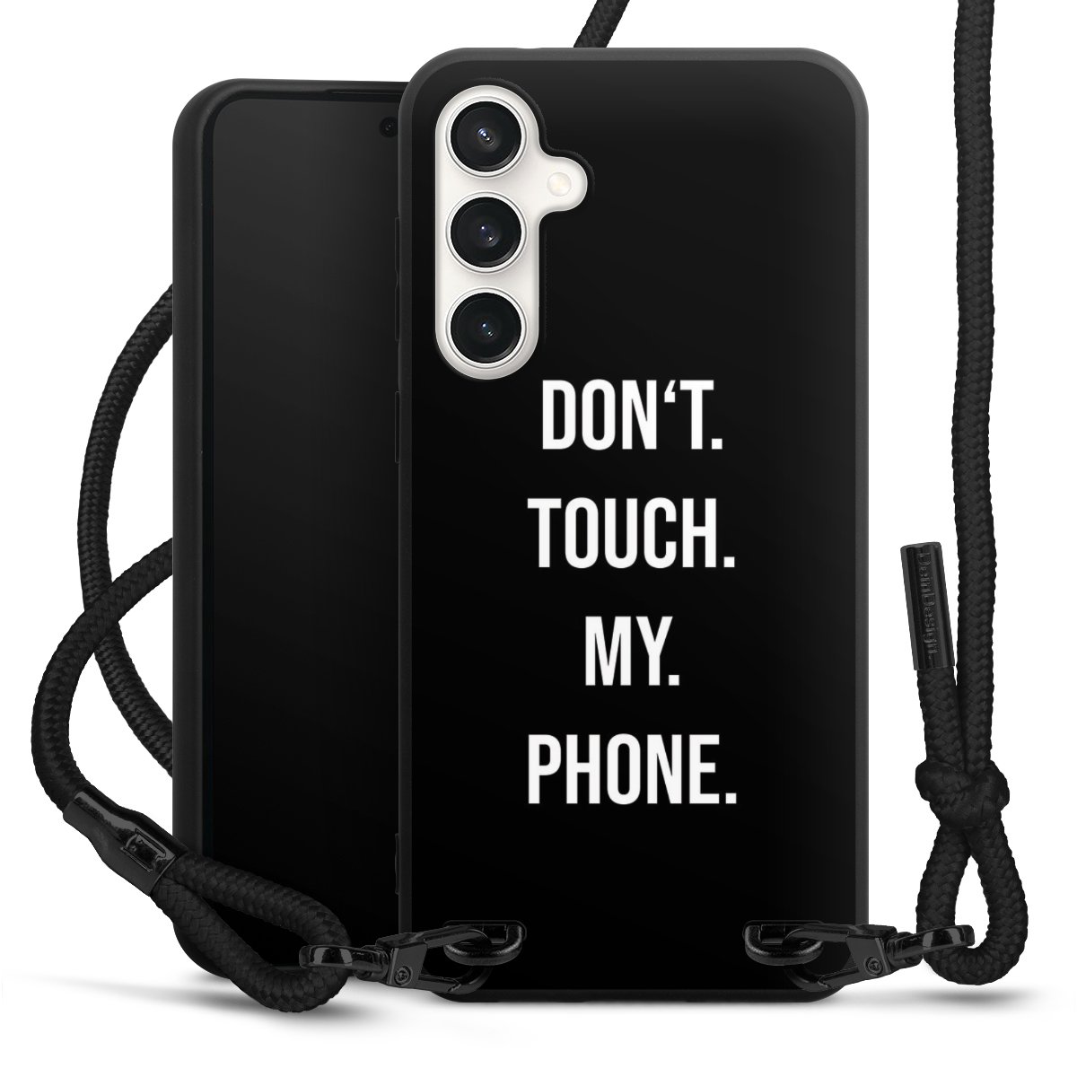 The matt black silicone case is made of flexible TPU (thermoplastic polyurethane) and offers robust protection. The durable, unbreakable material makes the cover flexible and dimensionally stable at the same time. The matte surface makes your design stand out more and is less susceptible to fingerprints and dirt. The stylish trend accessory fits comfortably in the hand and is perfectly complemented by the fabric (polyester) mobile phone strap. The braided fabric strap is approx. 1.70 metres long with a diameter of approx. 0.5 cm. Due to the special knotting technique, the length of the strap can be adjusted by simply pulling it, so that you can adapt it individually to your wishes. The practical case to wear around your neck is available with the fabric strap in black. As a little icing on the cake, we have provided the strap with a chic metal fastener in matt black. The strap is securely fastened to the case with loops made of high-quality genuine leather and press studs. The ends of the fabric strap are covered with metallic end caps and thus protected from fraying.