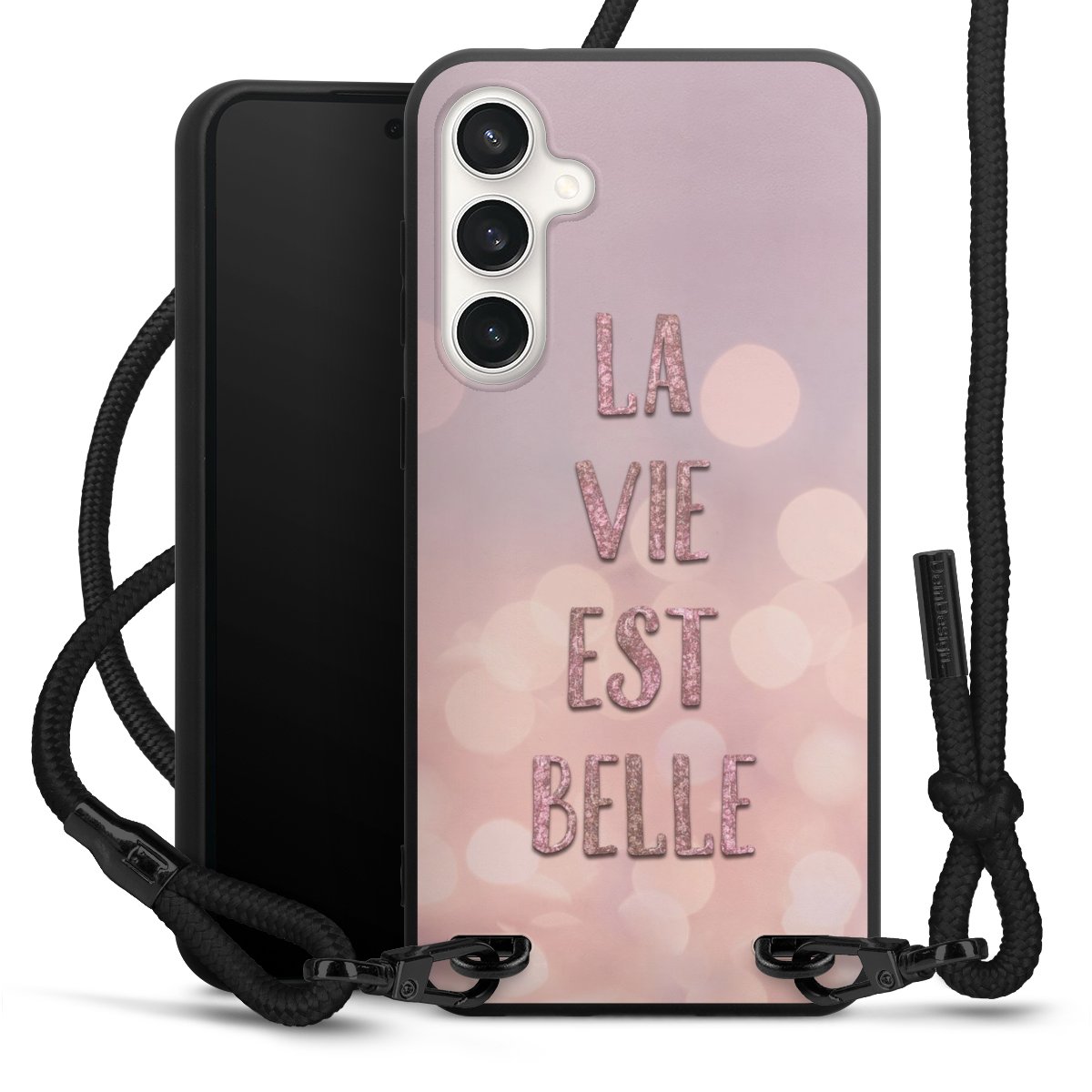 The matt black silicone case is made of flexible TPU (thermoplastic polyurethane) and offers robust protection. The durable, unbreakable material makes the cover flexible and dimensionally stable at the same time. The matte surface makes your design stand out more and is less susceptible to fingerprints and dirt. The stylish trend accessory fits comfortably in the hand and is perfectly complemented by the fabric (polyester) mobile phone strap. The braided fabric strap is approx. 1.70 metres long with a diameter of approx. 0.5 cm. Due to the special knotting technique, the length of the strap can be adjusted by simply pulling it, so that you can adapt it individually to your wishes. The practical case to wear around your neck is available with the fabric strap in black. As a little icing on the cake, we have provided the strap with a chic metal fastener in matt black. The strap is securely fastened to the case with loops made of high-quality genuine leather and press studs. The ends of the fabric strap are covered with metallic end caps and thus protected from fraying.