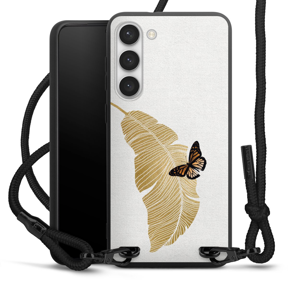 The matt black silicone case is made of flexible TPU (thermoplastic polyurethane) and offers robust protection. The durable, unbreakable material makes the cover flexible and dimensionally stable at the same time. The matte surface makes your design stand out more and is less susceptible to fingerprints and dirt. The stylish trend accessory fits comfortably in the hand and is perfectly complemented by the fabric (polyester) mobile phone strap. The braided fabric strap is approx. 1.70 metres long with a diameter of approx. 0.5 cm. Due to the special knotting technique, the length of the strap can be adjusted by simply pulling it, so that you can adapt it individually to your wishes. The practical case to wear around your neck is available with the fabric strap in black. As a little icing on the cake, we have provided the strap with a chic metal fastener in matt black. The strap is securely fastened to the case with loops made of high-quality genuine leather and press studs. The ends of the fabric strap are covered with metallic end caps and thus protected from fraying.