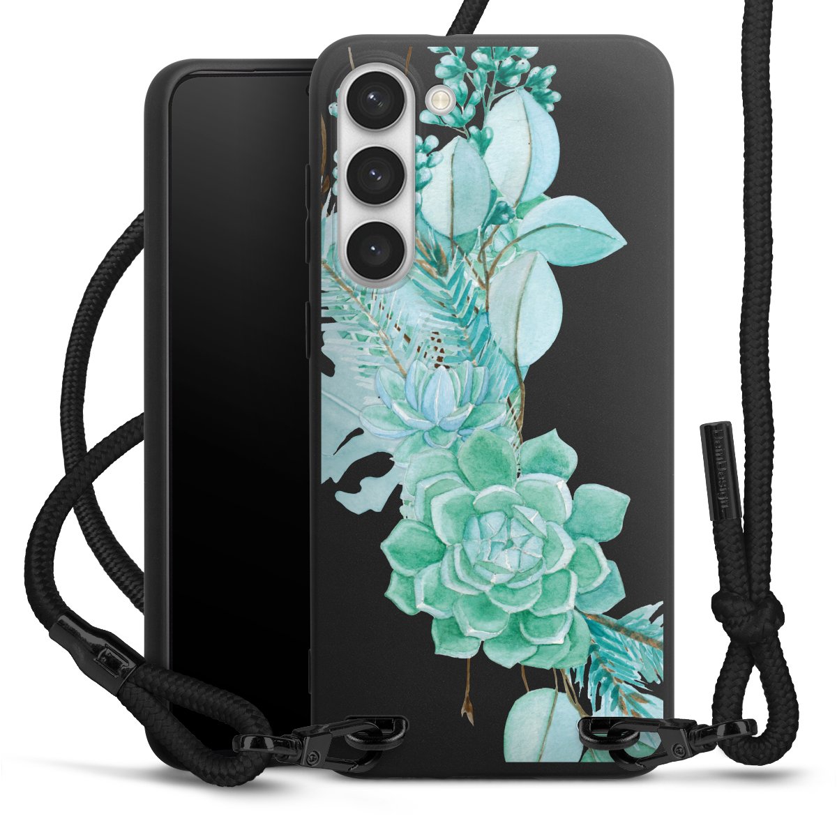 The matt black silicone case is made of flexible TPU (thermoplastic polyurethane) and offers robust protection. The durable, unbreakable material makes the cover flexible and dimensionally stable at the same time. The matte surface makes your design stand out more and is less susceptible to fingerprints and dirt. The stylish trend accessory fits comfortably in the hand and is perfectly complemented by the fabric (polyester) mobile phone strap. The braided fabric strap is approx. 1.70 metres long with a diameter of approx. 0.5 cm. Due to the special knotting technique, the length of the strap can be adjusted by simply pulling it, so that you can adapt it individually to your wishes. The practical case to wear around your neck is available with the fabric strap in black. As a little icing on the cake, we have provided the strap with a chic metal fastener in matt black. The strap is securely fastened to the case with loops made of high-quality genuine leather and press studs. The ends of the fabric strap are covered with metallic end caps and thus protected from fraying.