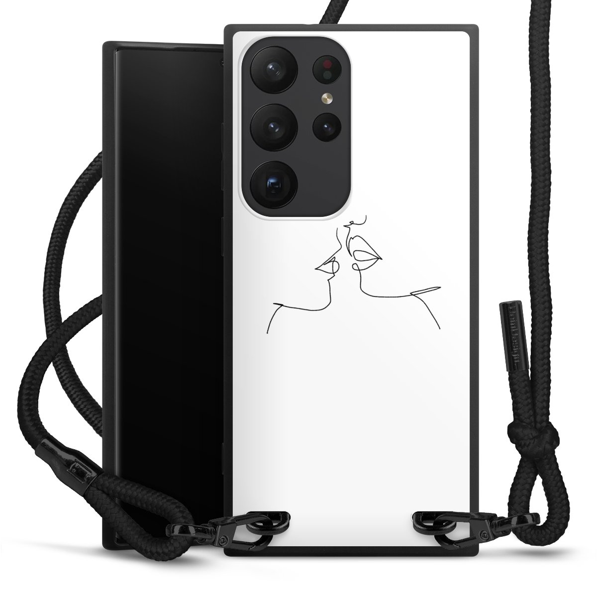 The matt black silicone case is made of flexible TPU (thermoplastic polyurethane) and offers robust protection. The durable, unbreakable material makes the cover flexible and dimensionally stable at the same time. The matte surface makes your design stand out more and is less susceptible to fingerprints and dirt. The stylish trend accessory fits comfortably in the hand and is perfectly complemented by the fabric (polyester) mobile phone strap. The braided fabric strap is approx. 1.70 metres long with a diameter of approx. 0.5 cm. Due to the special knotting technique, the length of the strap can be adjusted by simply pulling it, so that you can adapt it individually to your wishes. The practical case to wear around your neck is available with the fabric strap in black. As a little icing on the cake, we have provided the strap with a chic metal fastener in matt black. The strap is securely fastened to the case with loops made of high-quality genuine leather and press studs. The ends of the fabric strap are covered with metallic end caps and thus protected from fraying.