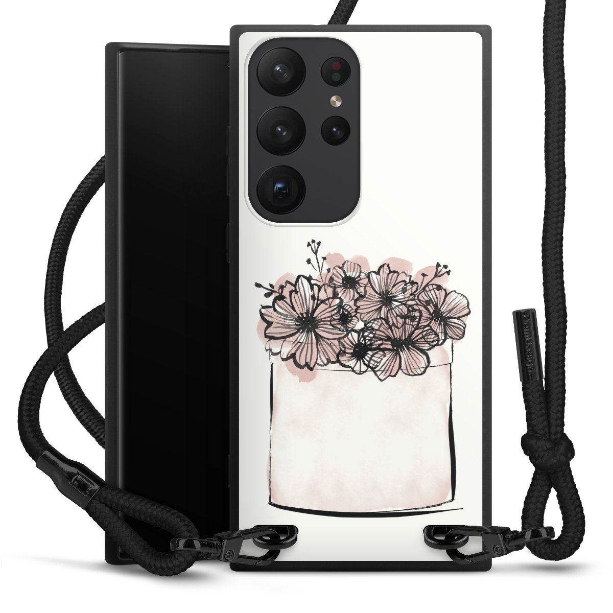 The matt black silicone case is made of flexible TPU (thermoplastic polyurethane) and offers robust protection. The durable, unbreakable material makes the cover flexible and dimensionally stable at the same time. The matte surface makes your design stand out more and is less susceptible to fingerprints and dirt. The stylish trend accessory fits comfortably in the hand and is perfectly complemented by the fabric (polyester) mobile phone strap. The braided fabric strap is approx. 1.70 metres long with a diameter of approx. 0.5 cm. Due to the special knotting technique, the length of the strap can be adjusted by simply pulling it, so that you can adapt it individually to your wishes. The practical case to wear around your neck is available with the fabric strap in black. As a little icing on the cake, we have provided the strap with a chic metal fastener in matt black. The strap is securely fastened to the case with loops made of high-quality genuine leather and press studs. The ends of the fabric strap are covered with metallic end caps and thus protected from fraying.