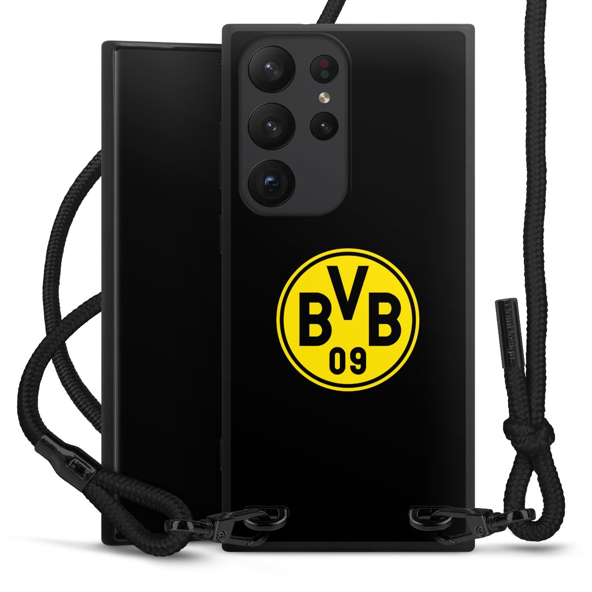 The matt black silicone case is made of flexible TPU (thermoplastic polyurethane) and offers robust protection. The durable, unbreakable material makes the cover flexible and dimensionally stable at the same time. The matte surface makes your design stand out more and is less susceptible to fingerprints and dirt. The stylish trend accessory fits comfortably in the hand and is perfectly complemented by the fabric (polyester) mobile phone strap. The braided fabric strap is approx. 1.70 metres long with a diameter of approx. 0.5 cm. Due to the special knotting technique, the length of the strap can be adjusted by simply pulling it, so that you can adapt it individually to your wishes. The practical case to wear around your neck is available with the fabric strap in black. As a little icing on the cake, we have provided the strap with a chic metal fastener in matt black. The strap is securely fastened to the case with loops made of high-quality genuine leather and press studs. The ends of the fabric strap are covered with metallic end caps and thus protected from fraying.