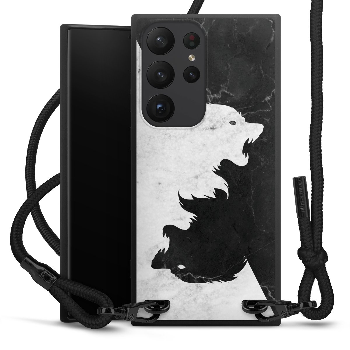 The matt black silicone case is made of flexible TPU (thermoplastic polyurethane) and offers robust protection. The durable, unbreakable material makes the cover flexible and dimensionally stable at the same time. The matte surface makes your design stand out more and is less susceptible to fingerprints and dirt. The stylish trend accessory fits comfortably in the hand and is perfectly complemented by the fabric (polyester) mobile phone strap. The braided fabric strap is approx. 1.70 metres long with a diameter of approx. 0.5 cm. Due to the special knotting technique, the length of the strap can be adjusted by simply pulling it, so that you can adapt it individually to your wishes. The practical case to wear around your neck is available with the fabric strap in black. As a little icing on the cake, we have provided the strap with a chic metal fastener in matt black. The strap is securely fastened to the case with loops made of high-quality genuine leather and press studs. The ends of the fabric strap are covered with metallic end caps and thus protected from fraying.