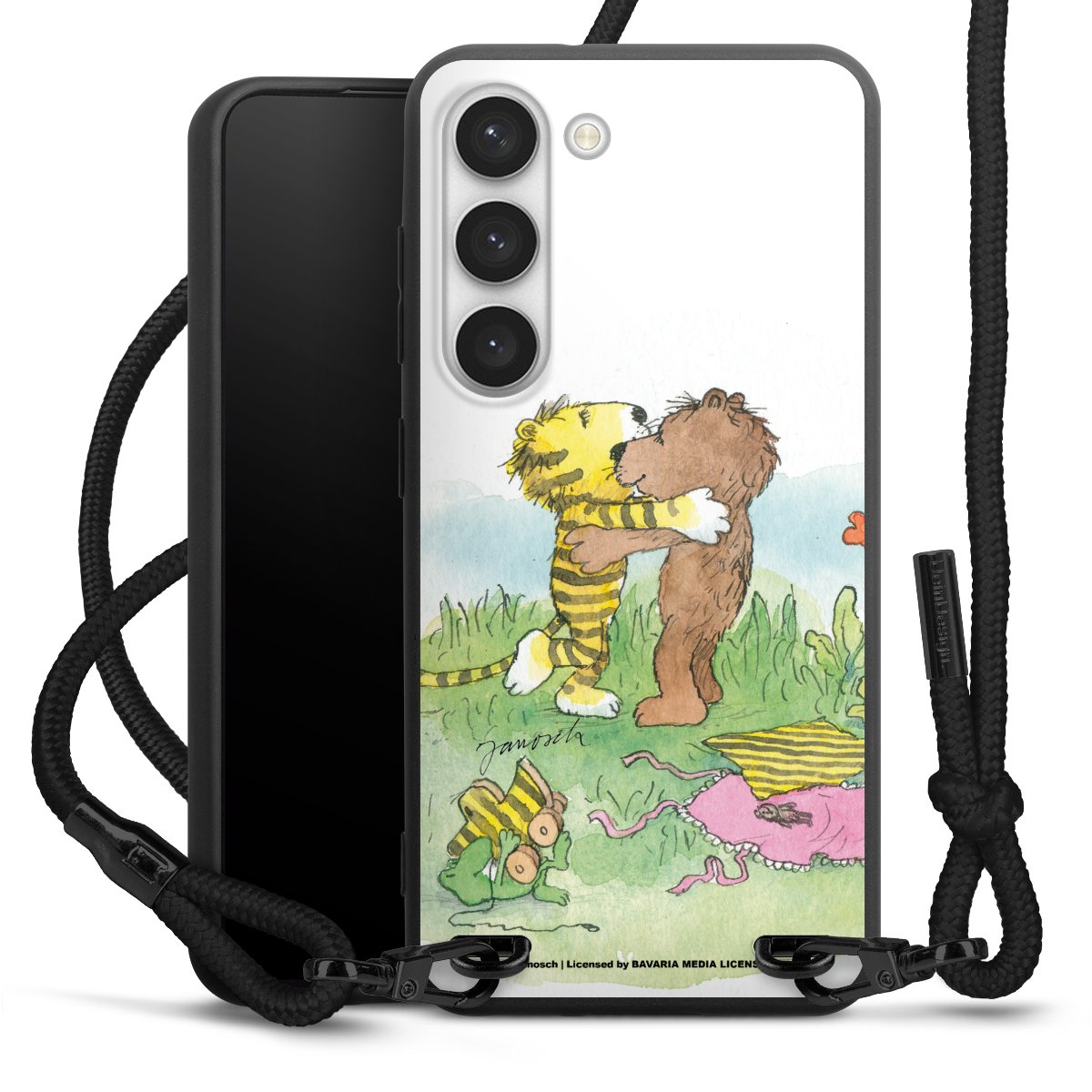 The matt black silicone case is made of flexible TPU (thermoplastic polyurethane) and offers robust protection. The durable, unbreakable material makes the cover flexible and dimensionally stable at the same time. The matte surface makes your design stand out more and is less susceptible to fingerprints and dirt. The stylish trend accessory fits comfortably in the hand and is perfectly complemented by the fabric (polyester) mobile phone strap. The braided fabric strap is approx. 1.70 metres long with a diameter of approx. 0.5 cm. Due to the special knotting technique, the length of the strap can be adjusted by simply pulling it, so that you can adapt it individually to your wishes. The practical case to wear around your neck is available with the fabric strap in black. As a little icing on the cake, we have provided the strap with a chic metal fastener in matt black. The strap is securely fastened to the case with loops made of high-quality genuine leather and press studs. The ends of the fabric strap are covered with metallic end caps and thus protected from fraying.