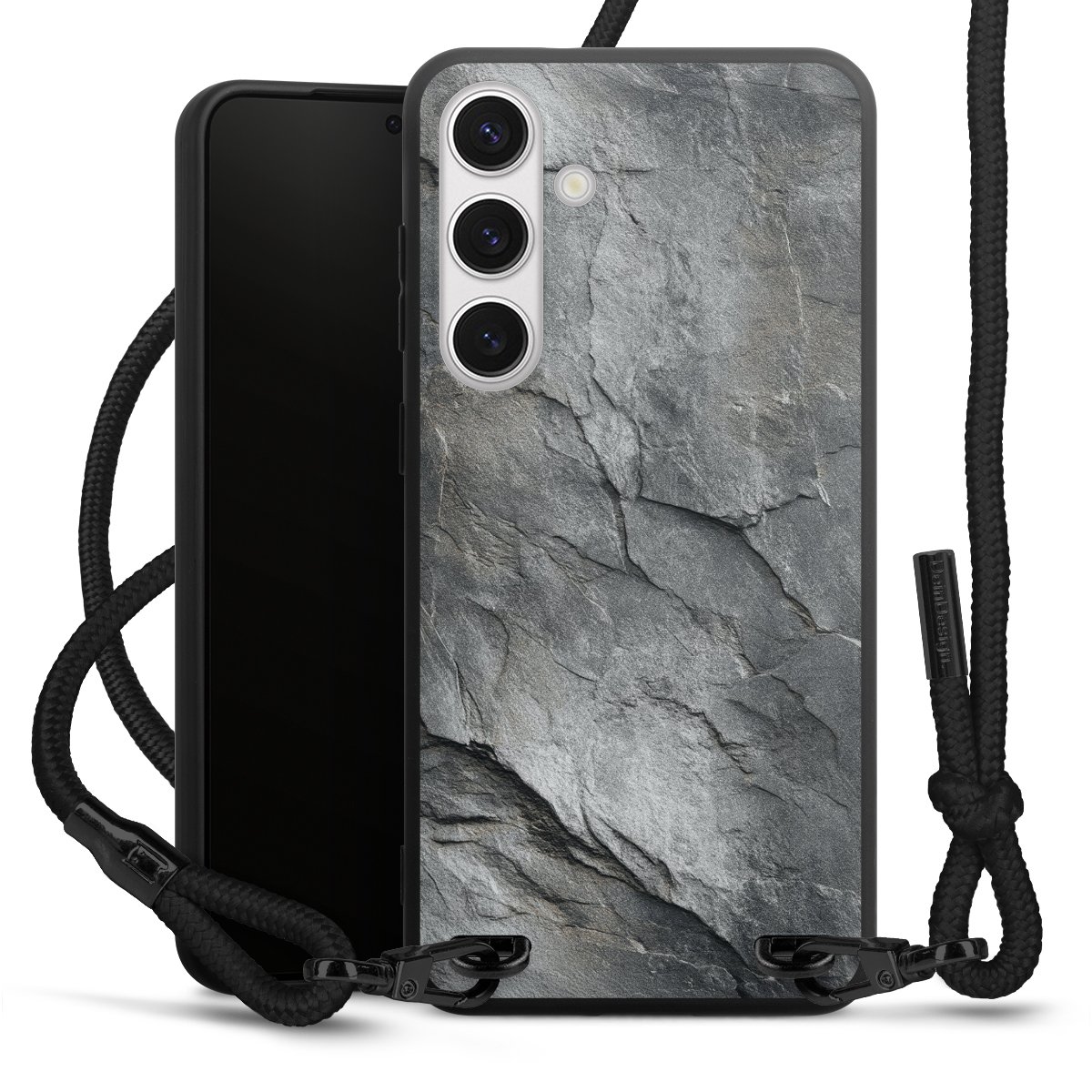 The matt black silicone case is made of flexible TPU (thermoplastic polyurethane) and offers robust protection. The durable, unbreakable material makes the cover flexible and dimensionally stable at the same time. The matte surface makes your design stand out more and is less susceptible to fingerprints and dirt. The stylish trend accessory fits comfortably in the hand and is perfectly complemented by the fabric (polyester) mobile phone strap. The braided fabric strap is approx. 1.70 metres long with a diameter of approx. 0.5 cm. Due to the special knotting technique, the length of the strap can be adjusted by simply pulling it, so that you can adapt it individually to your wishes. The practical case to wear around your neck is available with the fabric strap in black. As a little icing on the cake, we have provided the strap with a chic metal fastener in matt black. The strap is securely fastened to the case with loops made of high-quality genuine leather and press studs. The ends of the fabric strap are covered with metallic end caps and thus protected from fraying.