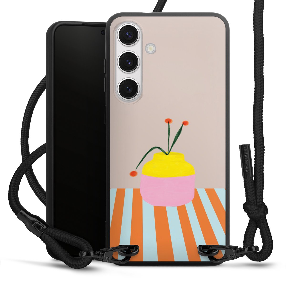 The matt black silicone case is made of flexible TPU (thermoplastic polyurethane) and offers robust protection. The durable, unbreakable material makes the cover flexible and dimensionally stable at the same time. The matte surface makes your design stand out more and is less susceptible to fingerprints and dirt. The stylish trend accessory fits comfortably in the hand and is perfectly complemented by the fabric (polyester) mobile phone strap. The braided fabric strap is approx. 1.70 metres long with a diameter of approx. 0.5 cm. Due to the special knotting technique, the length of the strap can be adjusted by simply pulling it, so that you can adapt it individually to your wishes. The practical case to wear around your neck is available with the fabric strap in black. As a little icing on the cake, we have provided the strap with a chic metal fastener in matt black. The strap is securely fastened to the case with loops made of high-quality genuine leather and press studs. The ends of the fabric strap are covered with metallic end caps and thus protected from fraying.