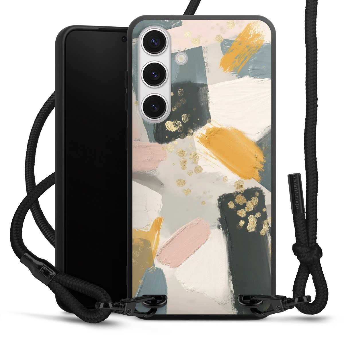The matt black silicone case is made of flexible TPU (thermoplastic polyurethane) and offers robust protection. The durable, unbreakable material makes the cover flexible and dimensionally stable at the same time. The matte surface makes your design stand out more and is less susceptible to fingerprints and dirt. The stylish trend accessory fits comfortably in the hand and is perfectly complemented by the fabric (polyester) mobile phone strap. The braided fabric strap is approx. 1.70 metres long with a diameter of approx. 0.5 cm. Due to the special knotting technique, the length of the strap can be adjusted by simply pulling it, so that you can adapt it individually to your wishes. The practical case to wear around your neck is available with the fabric strap in black. As a little icing on the cake, we have provided the strap with a chic metal fastener in matt black. The strap is securely fastened to the case with loops made of high-quality genuine leather and press studs. The ends of the fabric strap are covered with metallic end caps and thus protected from fraying.