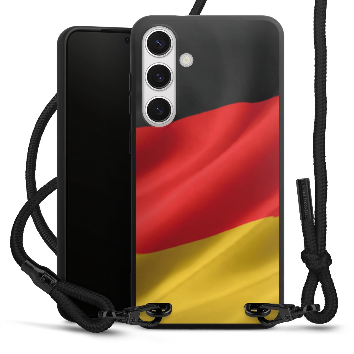 The matt black silicone case is made of flexible TPU (thermoplastic polyurethane) and offers robust protection. The durable, unbreakable material makes the cover flexible and dimensionally stable at the same time. The matte surface makes your design stand out more and is less susceptible to fingerprints and dirt. The stylish trend accessory fits comfortably in the hand and is perfectly complemented by the fabric (polyester) mobile phone strap. The braided fabric strap is approx. 1.70 metres long with a diameter of approx. 0.5 cm. Due to the special knotting technique, the length of the strap can be adjusted by simply pulling it, so that you can adapt it individually to your wishes. The practical case to wear around your neck is available with the fabric strap in black. As a little icing on the cake, we have provided the strap with a chic metal fastener in matt black. The strap is securely fastened to the case with loops made of high-quality genuine leather and press studs. The ends of the fabric strap are covered with metallic end caps and thus protected from fraying.