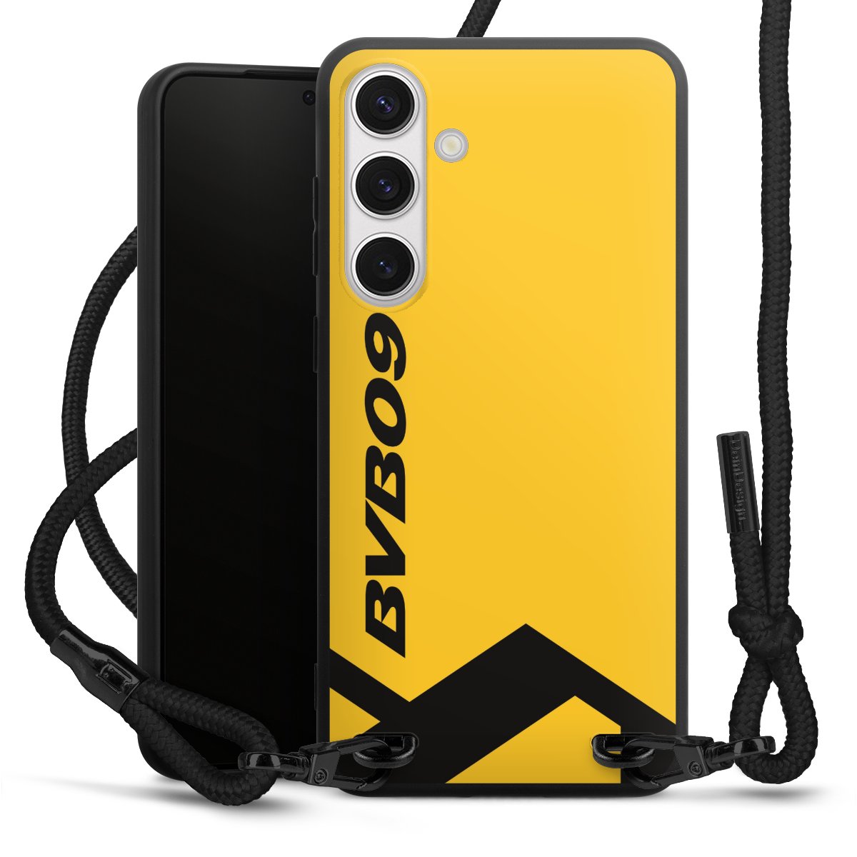 The matt black silicone case is made of flexible TPU (thermoplastic polyurethane) and offers robust protection. The durable, unbreakable material makes the cover flexible and dimensionally stable at the same time. The matte surface makes your design stand out more and is less susceptible to fingerprints and dirt. The stylish trend accessory fits comfortably in the hand and is perfectly complemented by the fabric (polyester) mobile phone strap. The braided fabric strap is approx. 1.70 metres long with a diameter of approx. 0.5 cm. Due to the special knotting technique, the length of the strap can be adjusted by simply pulling it, so that you can adapt it individually to your wishes. The practical case to wear around your neck is available with the fabric strap in black. As a little icing on the cake, we have provided the strap with a chic metal fastener in matt black. The strap is securely fastened to the case with loops made of high-quality genuine leather and press studs. The ends of the fabric strap are covered with metallic end caps and thus protected from fraying.