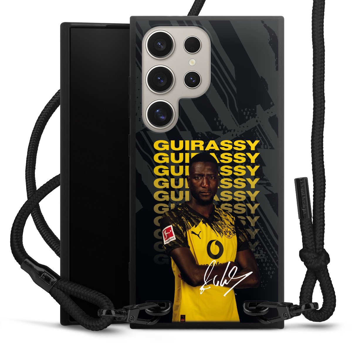 The matt black silicone case is made of flexible TPU (thermoplastic polyurethane) and offers robust protection. The durable, unbreakable material makes the cover flexible and dimensionally stable at the same time. The matte surface makes your design stand out more and is less susceptible to fingerprints and dirt. The stylish trend accessory fits comfortably in the hand and is perfectly complemented by the fabric (polyester) mobile phone strap. The braided fabric strap is approx. 1.70 metres long with a diameter of approx. 0.5 cm. Due to the special knotting technique, the length of the strap can be adjusted by simply pulling it, so that you can adapt it individually to your wishes. The practical case to wear around your neck is available with the fabric strap in black. As a little icing on the cake, we have provided the strap with a chic metal fastener in matt black. The strap is securely fastened to the case with loops made of high-quality genuine leather and press studs. The ends of the fabric strap are covered with metallic end caps and thus protected from fraying.