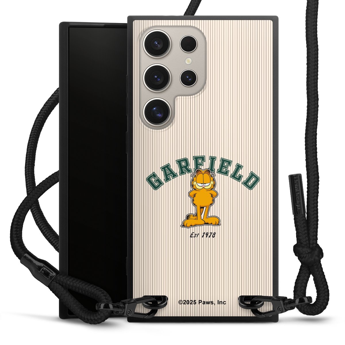 The matt black silicone case is made of flexible TPU (thermoplastic polyurethane) and offers robust protection. The durable, unbreakable material makes the cover flexible and dimensionally stable at the same time. The matte surface makes your design stand out more and is less susceptible to fingerprints and dirt. The stylish trend accessory fits comfortably in the hand and is perfectly complemented by the fabric (polyester) mobile phone strap. The braided fabric strap is approx. 1.70 metres long with a diameter of approx. 0.5 cm. Due to the special knotting technique, the length of the strap can be adjusted by simply pulling it, so that you can adapt it individually to your wishes. The practical case to wear around your neck is available with the fabric strap in black. As a little icing on the cake, we have provided the strap with a chic metal fastener in matt black. The strap is securely fastened to the case with loops made of high-quality genuine leather and press studs. The ends of the fabric strap are covered with metallic end caps and thus protected from fraying.