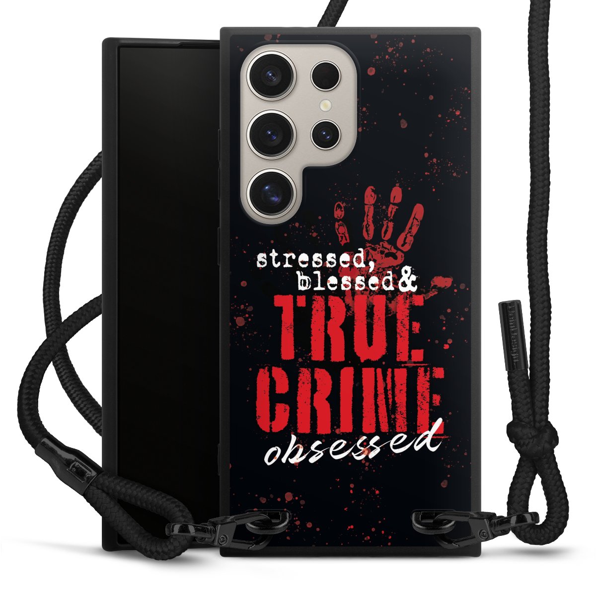 The matt black silicone case is made of flexible TPU (thermoplastic polyurethane) and offers robust protection. The durable, unbreakable material makes the cover flexible and dimensionally stable at the same time. The matte surface makes your design stand out more and is less susceptible to fingerprints and dirt. The stylish trend accessory fits comfortably in the hand and is perfectly complemented by the fabric (polyester) mobile phone strap. The braided fabric strap is approx. 1.70 metres long with a diameter of approx. 0.5 cm. Due to the special knotting technique, the length of the strap can be adjusted by simply pulling it, so that you can adapt it individually to your wishes. The practical case to wear around your neck is available with the fabric strap in black. As a little icing on the cake, we have provided the strap with a chic metal fastener in matt black. The strap is securely fastened to the case with loops made of high-quality genuine leather and press studs. The ends of the fabric strap are covered with metallic end caps and thus protected from fraying.