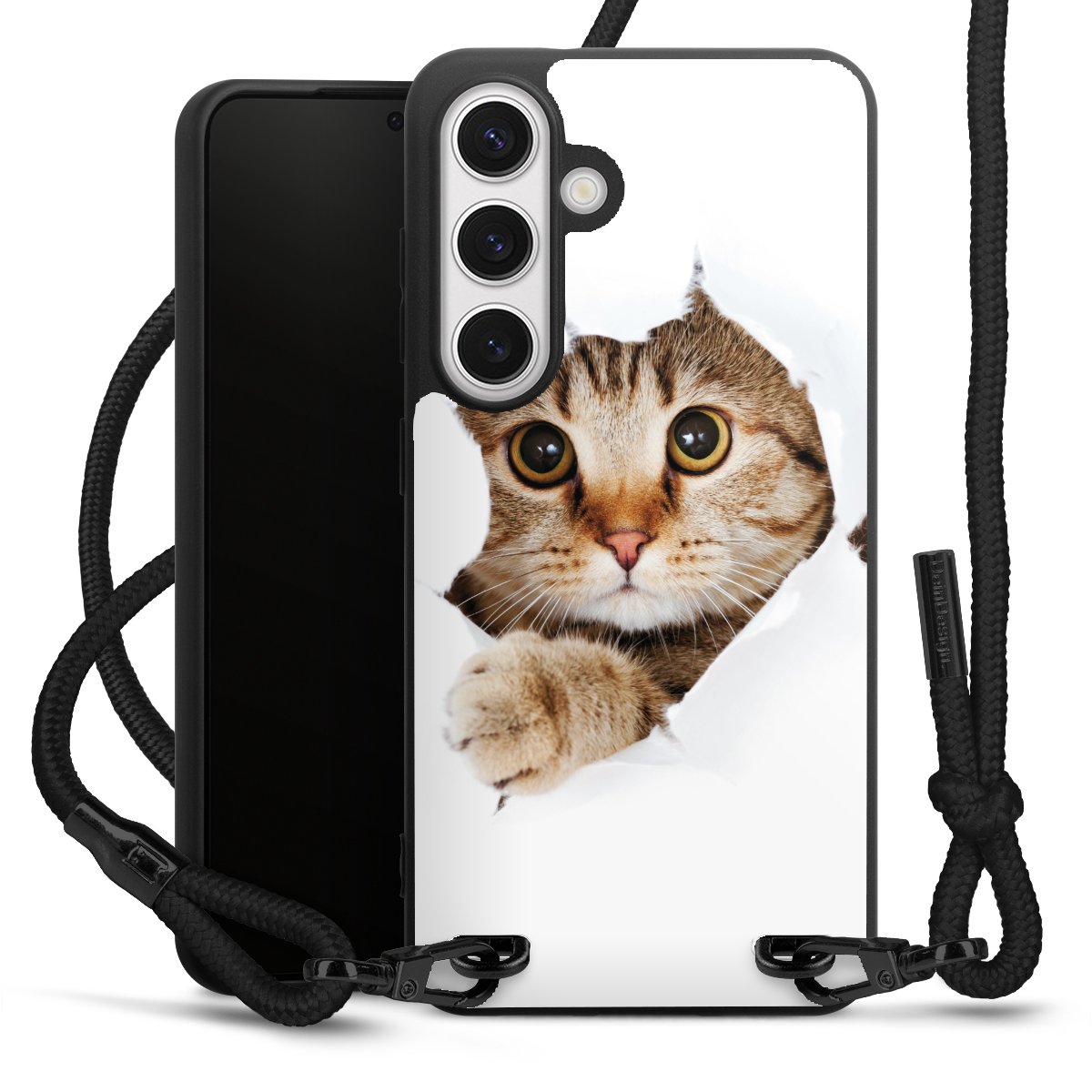 The matt black silicone case is made of flexible TPU (thermoplastic polyurethane) and offers robust protection. The durable, unbreakable material makes the cover flexible and dimensionally stable at the same time. The matte surface makes your design stand out more and is less susceptible to fingerprints and dirt. The stylish trend accessory fits comfortably in the hand and is perfectly complemented by the fabric (polyester) mobile phone strap. The braided fabric strap is approx. 1.70 metres long with a diameter of approx. 0.5 cm. Due to the special knotting technique, the length of the strap can be adjusted by simply pulling it, so that you can adapt it individually to your wishes. The practical case to wear around your neck is available with the fabric strap in black. As a little icing on the cake, we have provided the strap with a chic metal fastener in matt black. The strap is securely fastened to the case with loops made of high-quality genuine leather and press studs. The ends of the fabric strap are covered with metallic end caps and thus protected from fraying.