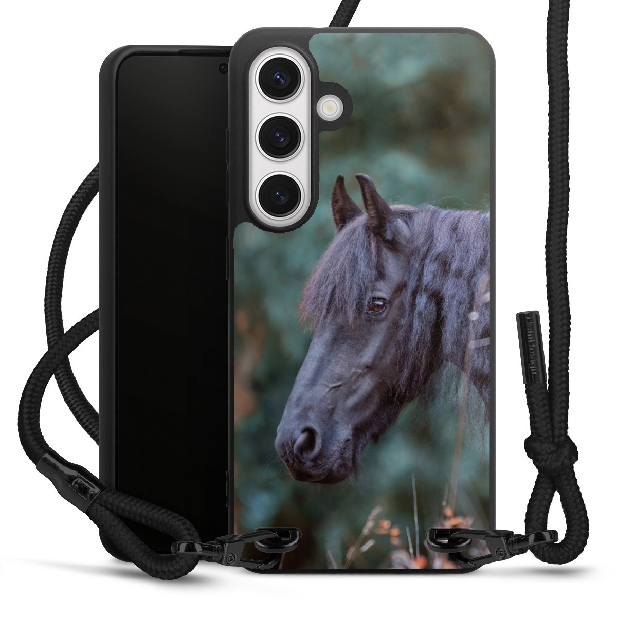 The matt black silicone case is made of flexible TPU (thermoplastic polyurethane) and offers robust protection. The durable, unbreakable material makes the cover flexible and dimensionally stable at the same time. The matte surface makes your design stand out more and is less susceptible to fingerprints and dirt. The stylish trend accessory fits comfortably in the hand and is perfectly complemented by the fabric (polyester) mobile phone strap. The braided fabric strap is approx. 1.70 metres long with a diameter of approx. 0.5 cm. Due to the special knotting technique, the length of the strap can be adjusted by simply pulling it, so that you can adapt it individually to your wishes. The practical case to wear around your neck is available with the fabric strap in black. As a little icing on the cake, we have provided the strap with a chic metal fastener in matt black. The strap is securely fastened to the case with loops made of high-quality genuine leather and press studs. The ends of the fabric strap are covered with metallic end caps and thus protected from fraying.