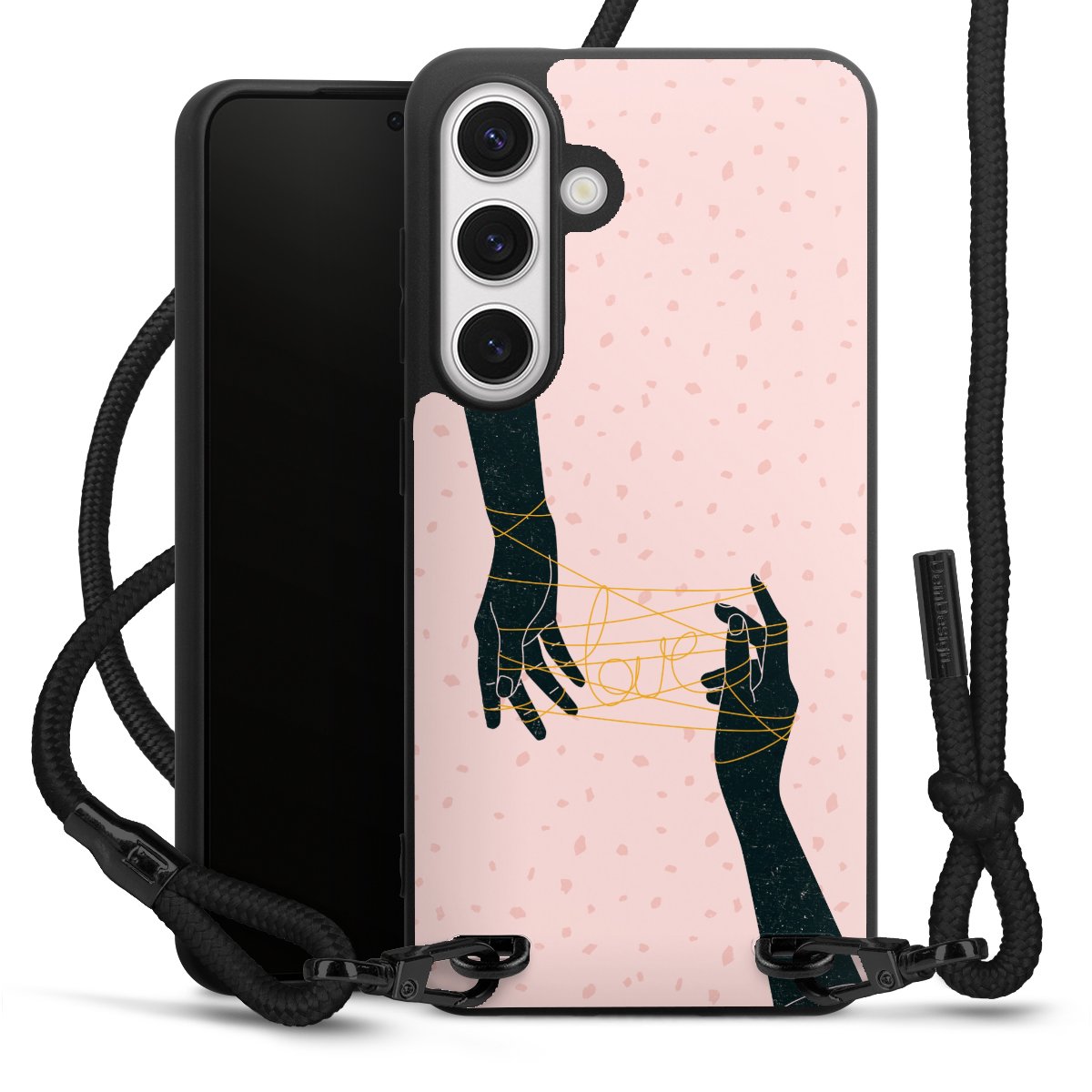 The matt black silicone case is made of flexible TPU (thermoplastic polyurethane) and offers robust protection. The durable, unbreakable material makes the cover flexible and dimensionally stable at the same time. The matte surface makes your design stand out more and is less susceptible to fingerprints and dirt. The stylish trend accessory fits comfortably in the hand and is perfectly complemented by the fabric (polyester) mobile phone strap. The braided fabric strap is approx. 1.70 metres long with a diameter of approx. 0.5 cm. Due to the special knotting technique, the length of the strap can be adjusted by simply pulling it, so that you can adapt it individually to your wishes. The practical case to wear around your neck is available with the fabric strap in black. As a little icing on the cake, we have provided the strap with a chic metal fastener in matt black. The strap is securely fastened to the case with loops made of high-quality genuine leather and press studs. The ends of the fabric strap are covered with metallic end caps and thus protected from fraying.