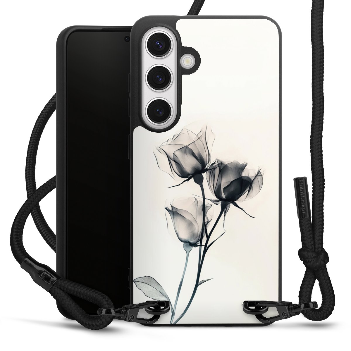 The matt black silicone case is made of flexible TPU (thermoplastic polyurethane) and offers robust protection. The durable, unbreakable material makes the cover flexible and dimensionally stable at the same time. The matte surface makes your design stand out more and is less susceptible to fingerprints and dirt. The stylish trend accessory fits comfortably in the hand and is perfectly complemented by the fabric (polyester) mobile phone strap. The braided fabric strap is approx. 1.70 metres long with a diameter of approx. 0.5 cm. Due to the special knotting technique, the length of the strap can be adjusted by simply pulling it, so that you can adapt it individually to your wishes. The practical case to wear around your neck is available with the fabric strap in black. As a little icing on the cake, we have provided the strap with a chic metal fastener in matt black. The strap is securely fastened to the case with loops made of high-quality genuine leather and press studs. The ends of the fabric strap are covered with metallic end caps and thus protected from fraying.