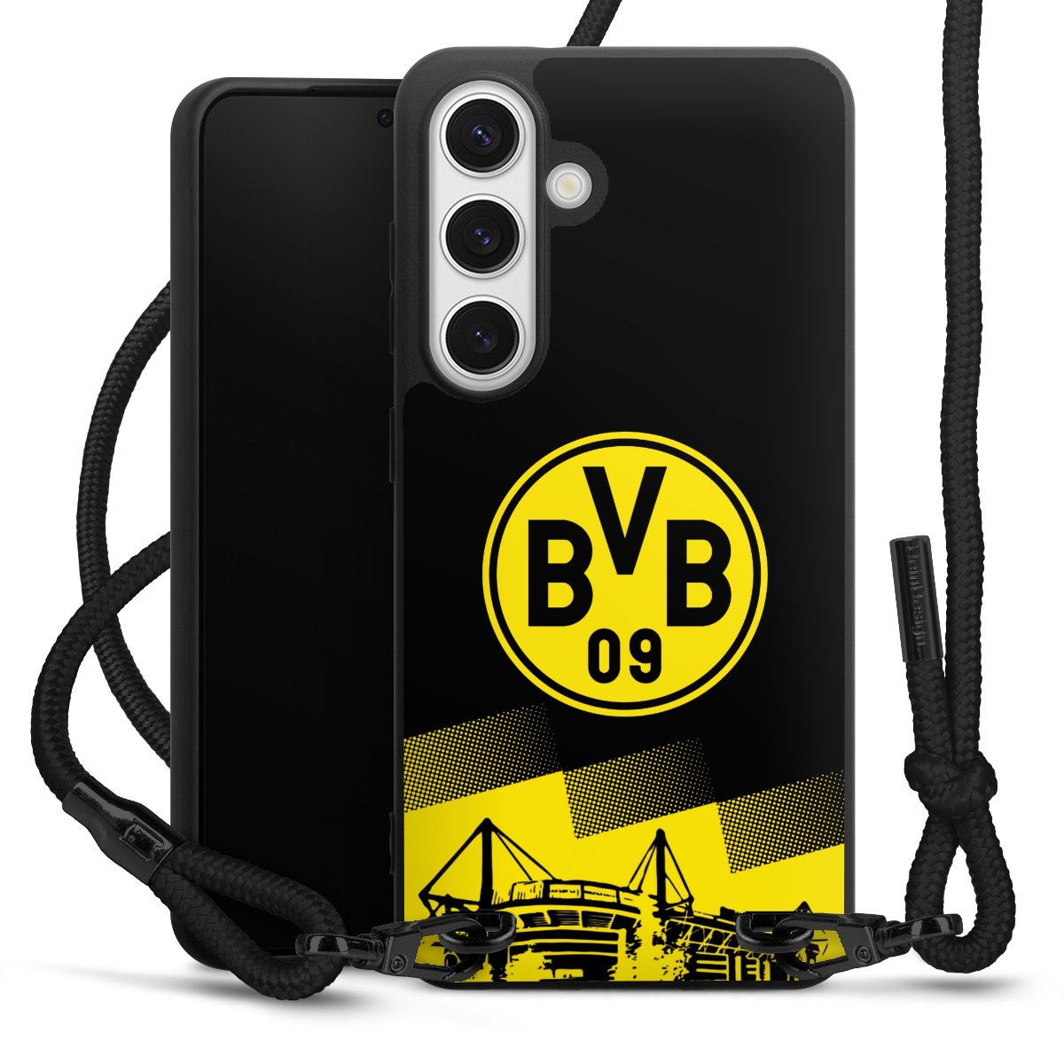 The matt black silicone case is made of flexible TPU (thermoplastic polyurethane) and offers robust protection. The durable, unbreakable material makes the cover flexible and dimensionally stable at the same time. The matte surface makes your design stand out more and is less susceptible to fingerprints and dirt. The stylish trend accessory fits comfortably in the hand and is perfectly complemented by the fabric (polyester) mobile phone strap. The braided fabric strap is approx. 1.70 metres long with a diameter of approx. 0.5 cm. Due to the special knotting technique, the length of the strap can be adjusted by simply pulling it, so that you can adapt it individually to your wishes. The practical case to wear around your neck is available with the fabric strap in black. As a little icing on the cake, we have provided the strap with a chic metal fastener in matt black. The strap is securely fastened to the case with loops made of high-quality genuine leather and press studs. The ends of the fabric strap are covered with metallic end caps and thus protected from fraying.