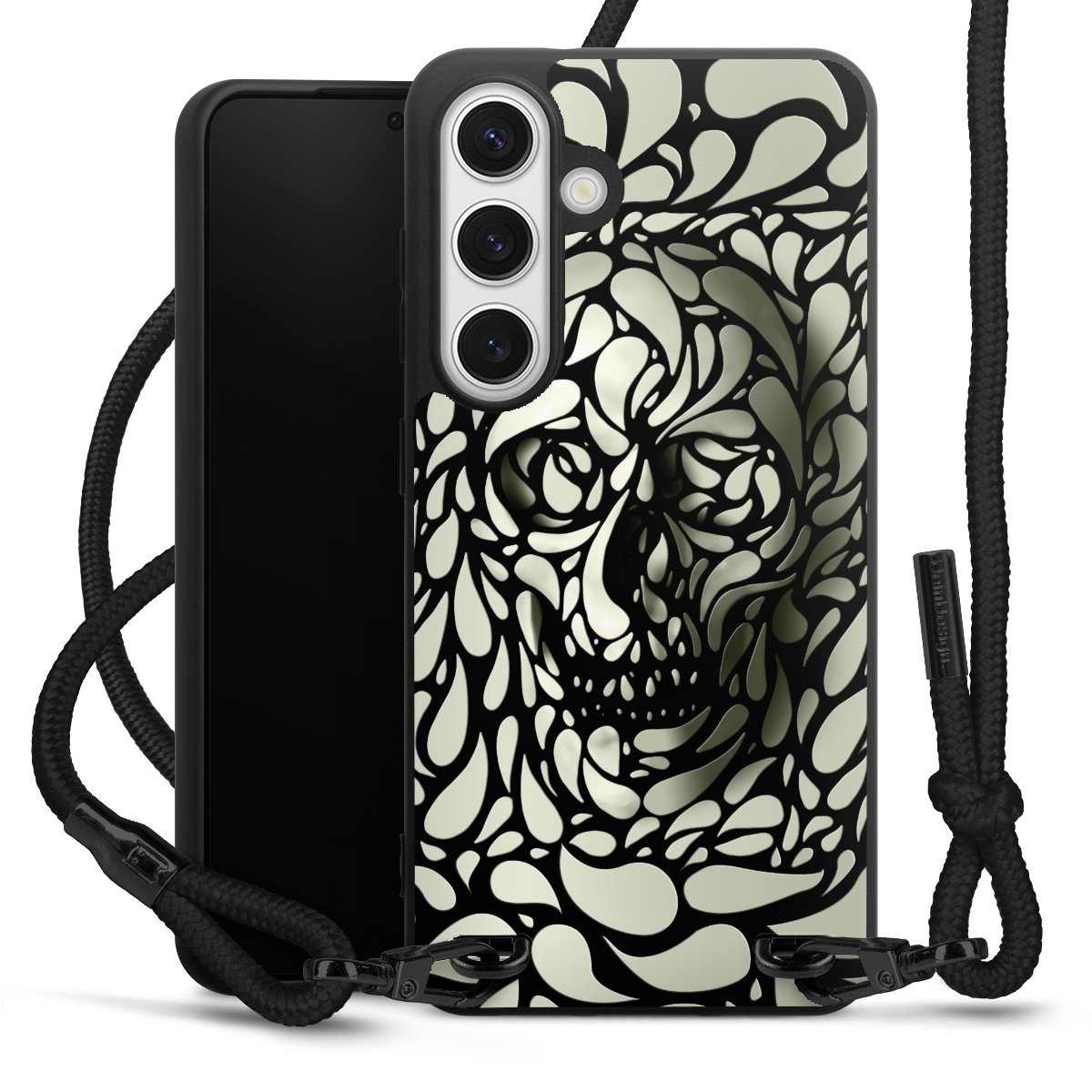 The matt black silicone case is made of flexible TPU (thermoplastic polyurethane) and offers robust protection. The durable, unbreakable material makes the cover flexible and dimensionally stable at the same time. The matte surface makes your design stand out more and is less susceptible to fingerprints and dirt. The stylish trend accessory fits comfortably in the hand and is perfectly complemented by the fabric (polyester) mobile phone strap. The braided fabric strap is approx. 1.70 metres long with a diameter of approx. 0.5 cm. Due to the special knotting technique, the length of the strap can be adjusted by simply pulling it, so that you can adapt it individually to your wishes. The practical case to wear around your neck is available with the fabric strap in black. As a little icing on the cake, we have provided the strap with a chic metal fastener in matt black. The strap is securely fastened to the case with loops made of high-quality genuine leather and press studs. The ends of the fabric strap are covered with metallic end caps and thus protected from fraying.