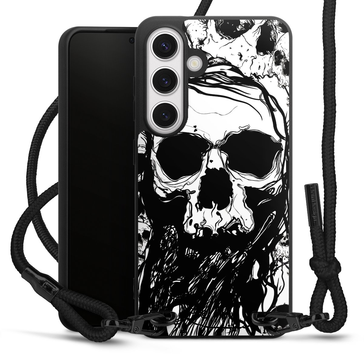 The matt black silicone case is made of flexible TPU (thermoplastic polyurethane) and offers robust protection. The durable, unbreakable material makes the cover flexible and dimensionally stable at the same time. The matte surface makes your design stand out more and is less susceptible to fingerprints and dirt. The stylish trend accessory fits comfortably in the hand and is perfectly complemented by the fabric (polyester) mobile phone strap. The braided fabric strap is approx. 1.70 metres long with a diameter of approx. 0.5 cm. Due to the special knotting technique, the length of the strap can be adjusted by simply pulling it, so that you can adapt it individually to your wishes. The practical case to wear around your neck is available with the fabric strap in black. As a little icing on the cake, we have provided the strap with a chic metal fastener in matt black. The strap is securely fastened to the case with loops made of high-quality genuine leather and press studs. The ends of the fabric strap are covered with metallic end caps and thus protected from fraying.