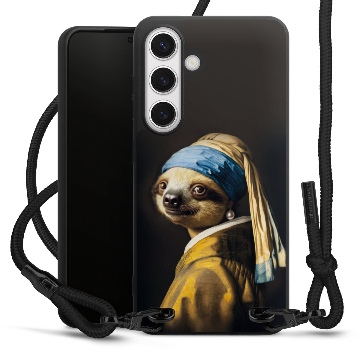The matt black silicone case is made of flexible TPU (thermoplastic polyurethane) and offers robust protection. The durable, unbreakable material makes the cover flexible and dimensionally stable at the same time. The matte surface makes your design stand out more and is less susceptible to fingerprints and dirt. The stylish trend accessory fits comfortably in the hand and is perfectly complemented by the fabric (polyester) mobile phone strap. The braided fabric strap is approx. 1.70 metres long with a diameter of approx. 0.5 cm. Due to the special knotting technique, the length of the strap can be adjusted by simply pulling it, so that you can adapt it individually to your wishes. The practical case to wear around your neck is available with the fabric strap in black. As a little icing on the cake, we have provided the strap with a chic metal fastener in matt black. The strap is securely fastened to the case with loops made of high-quality genuine leather and press studs. The ends of the fabric strap are covered with metallic end caps and thus protected from fraying.